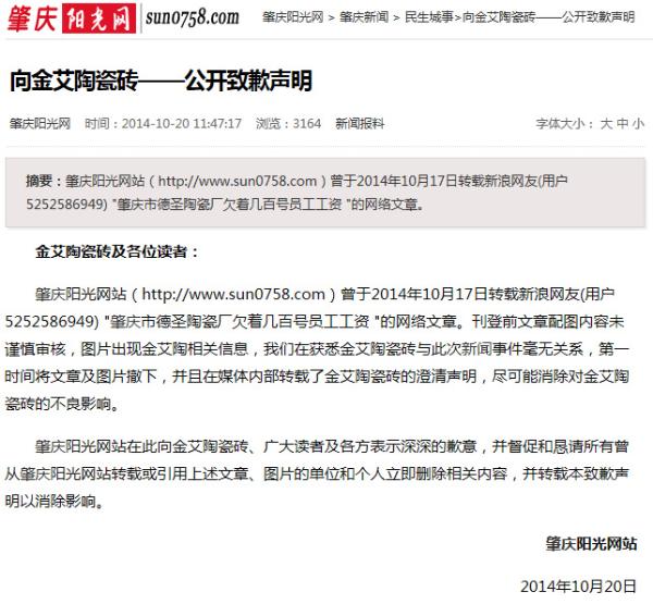 肇庆阳光网向香蕉APP直播陶瓷砖——公开致歉声明