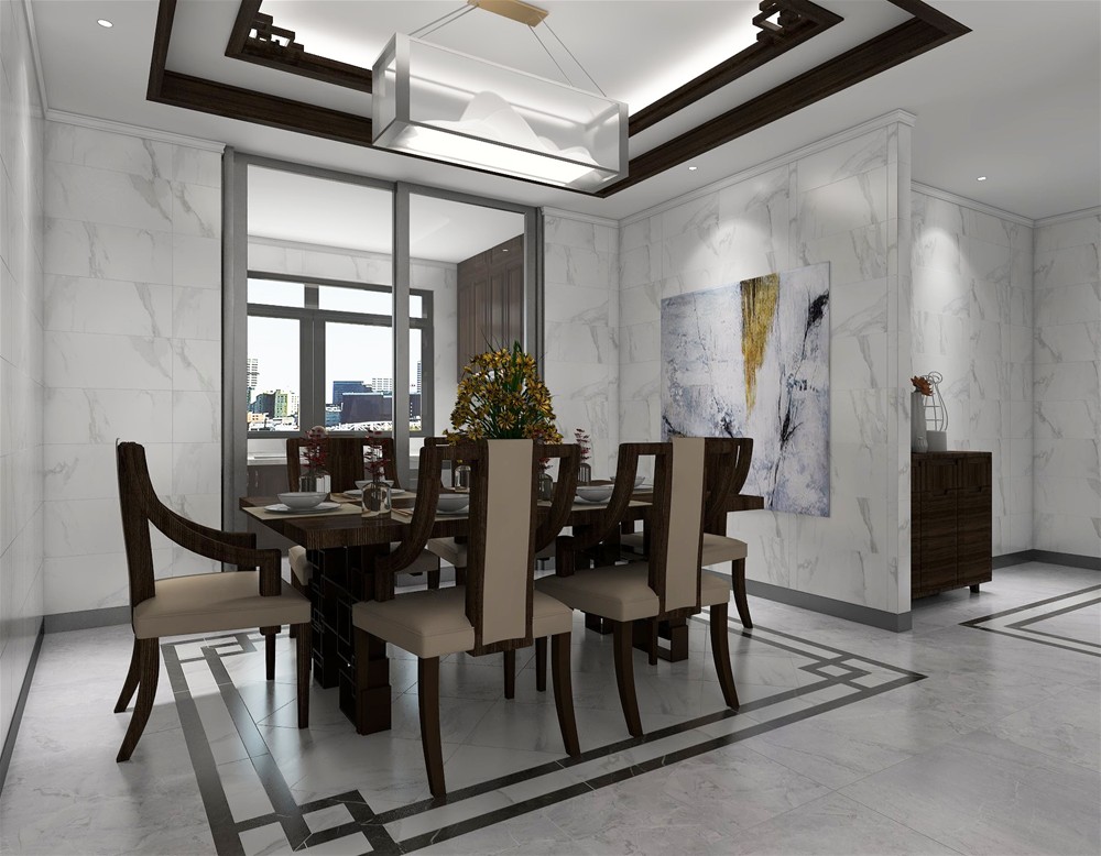 新中式餐厅地面主砖 缎光釉KFD880+地面拼花缎光釉KFD8806+墙面缎光釉KFD8801