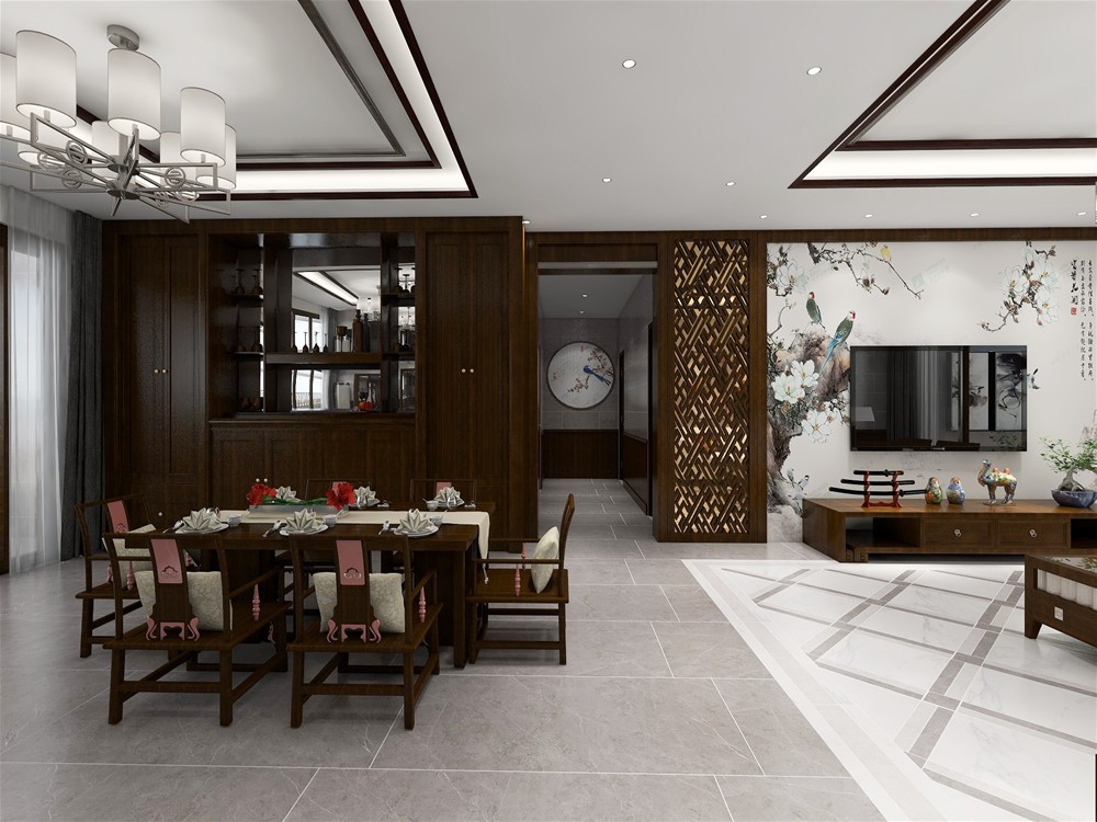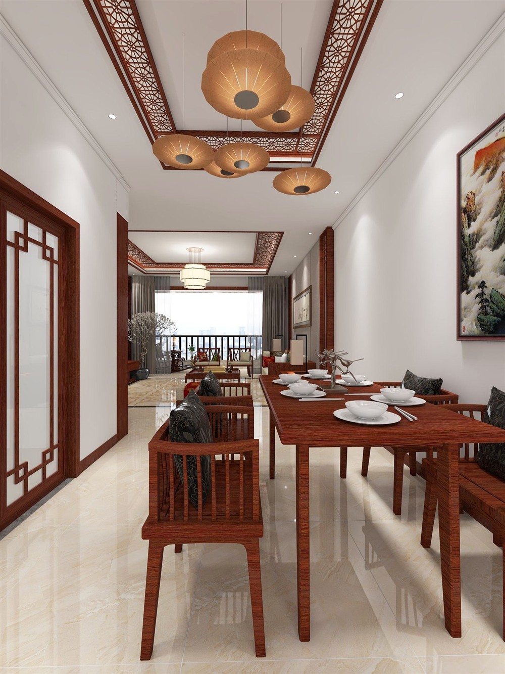 开放式的餐厅与客厅相连通,中间的走廊让客厅、餐厅区域分明,餐厅矩形餐桌和复古的吊灯组合,天花是简单的雕花,留住了中式韵味注入了新中式的创新元素。