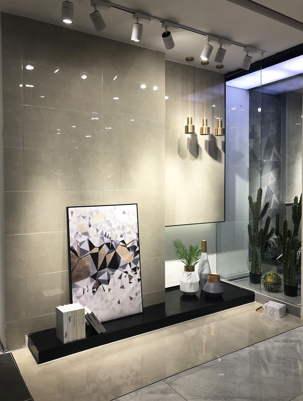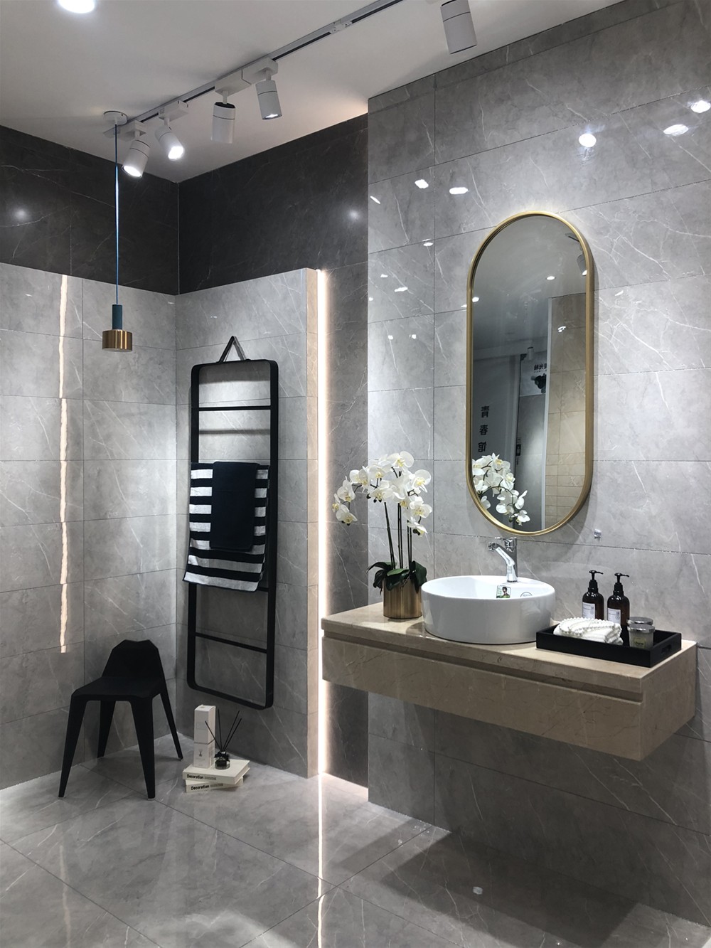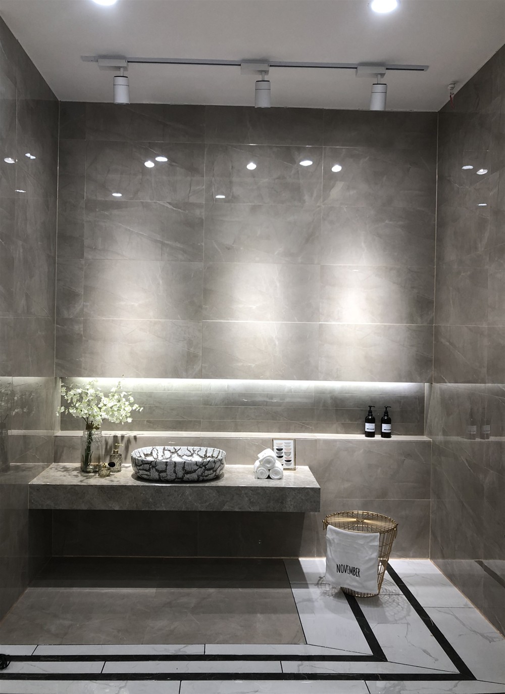 墙面可作电视背景墙、客厅地砖、沙发背景墙、厨卫用砖。高级灰亮面砖深受年轻人喜爱,也很好搭配突出空间效果。