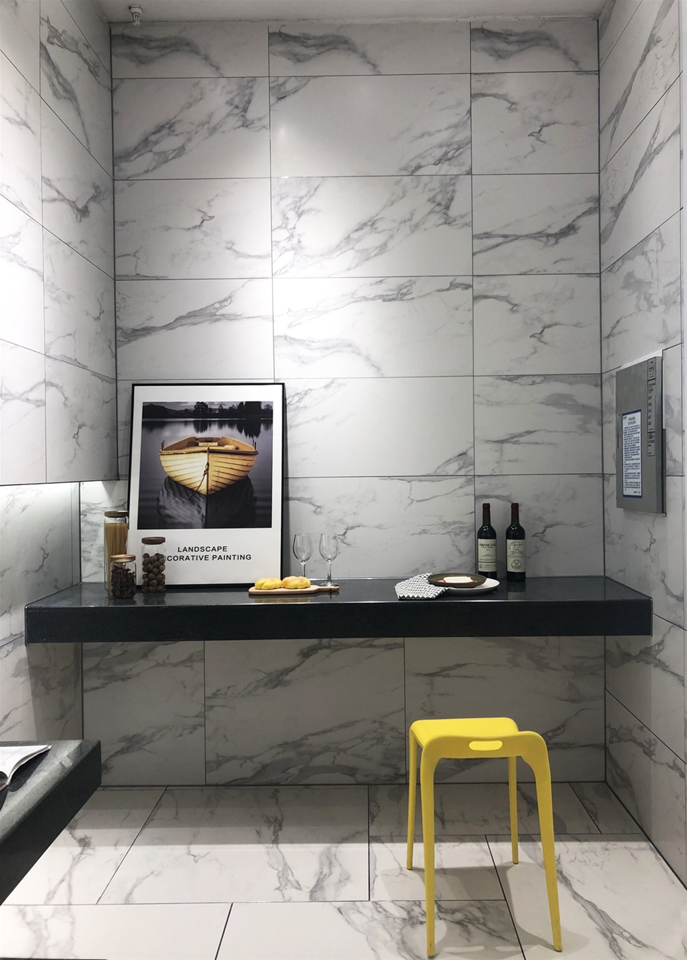 墙面可作沙发背景墙、电视背景墙、厨卫墙面和客厅地砖使用。亮面砖很好地提亮整个空间的光感。