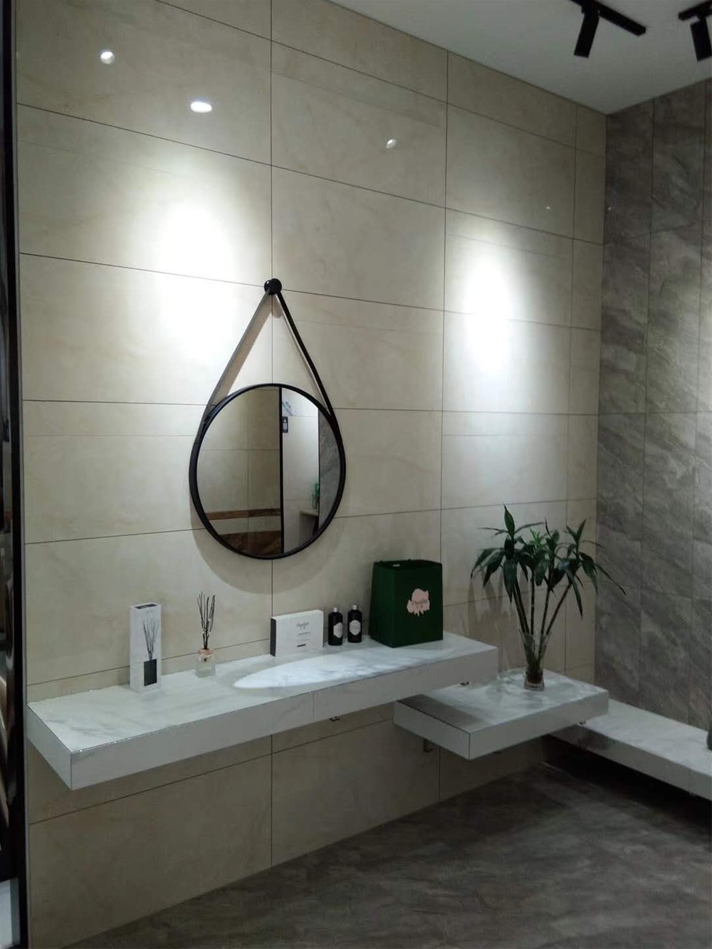 这是15°缎光釉铺设的现代风格模拟间,没有更多造型,简单的瓷砖切割铺贴,优雅大气的瓷砖纹理运用错位铺贴而成的墙面。