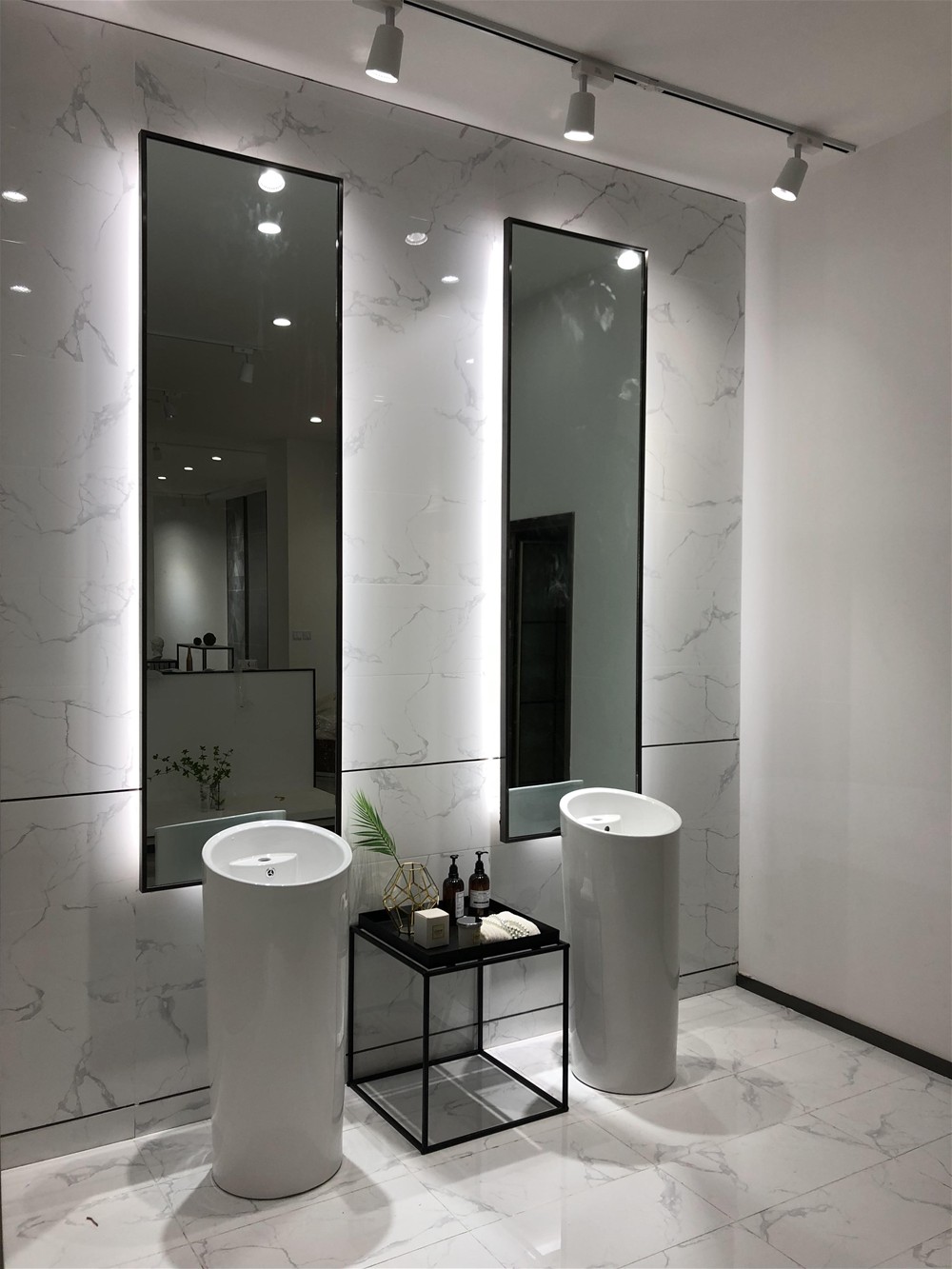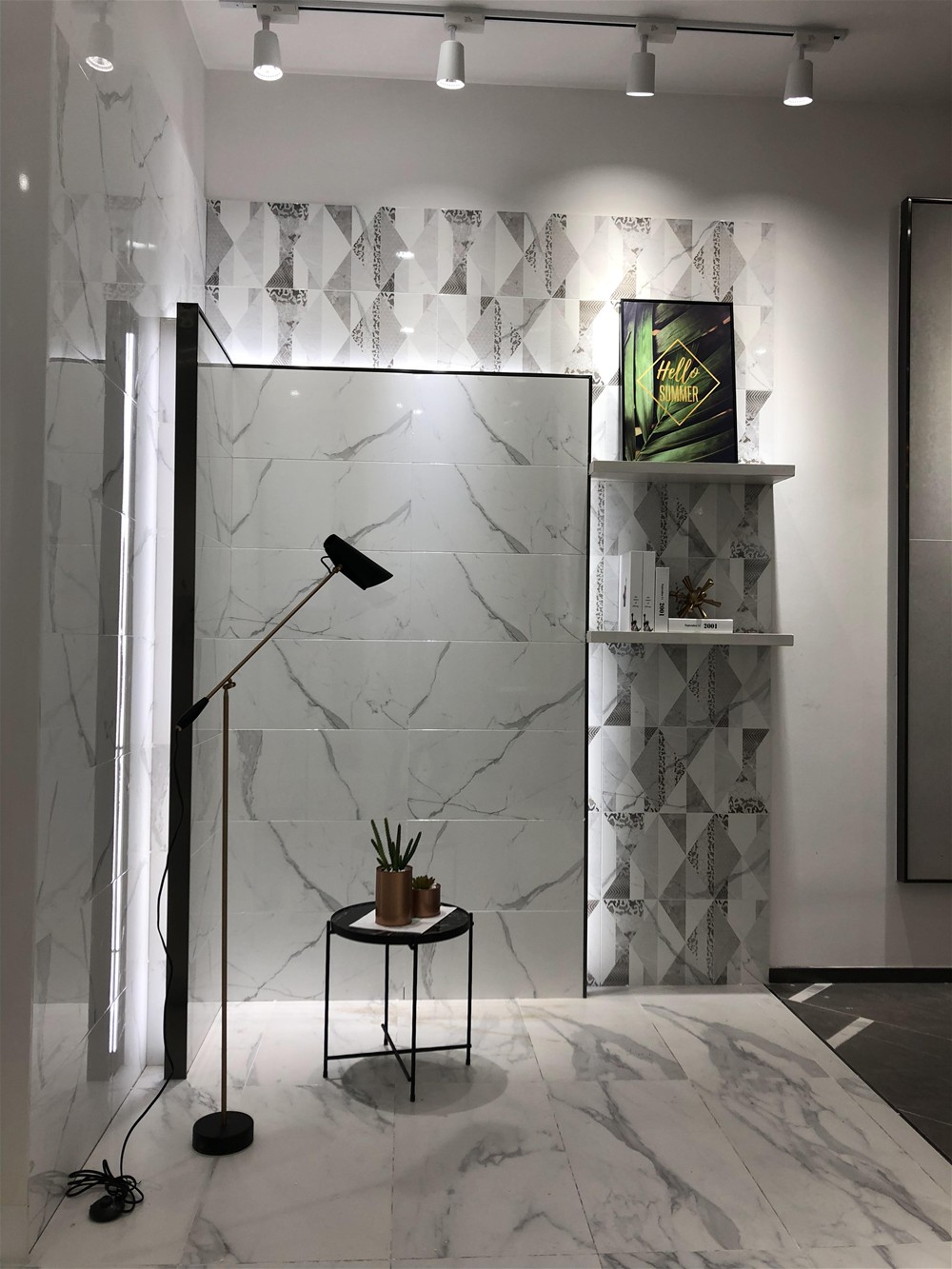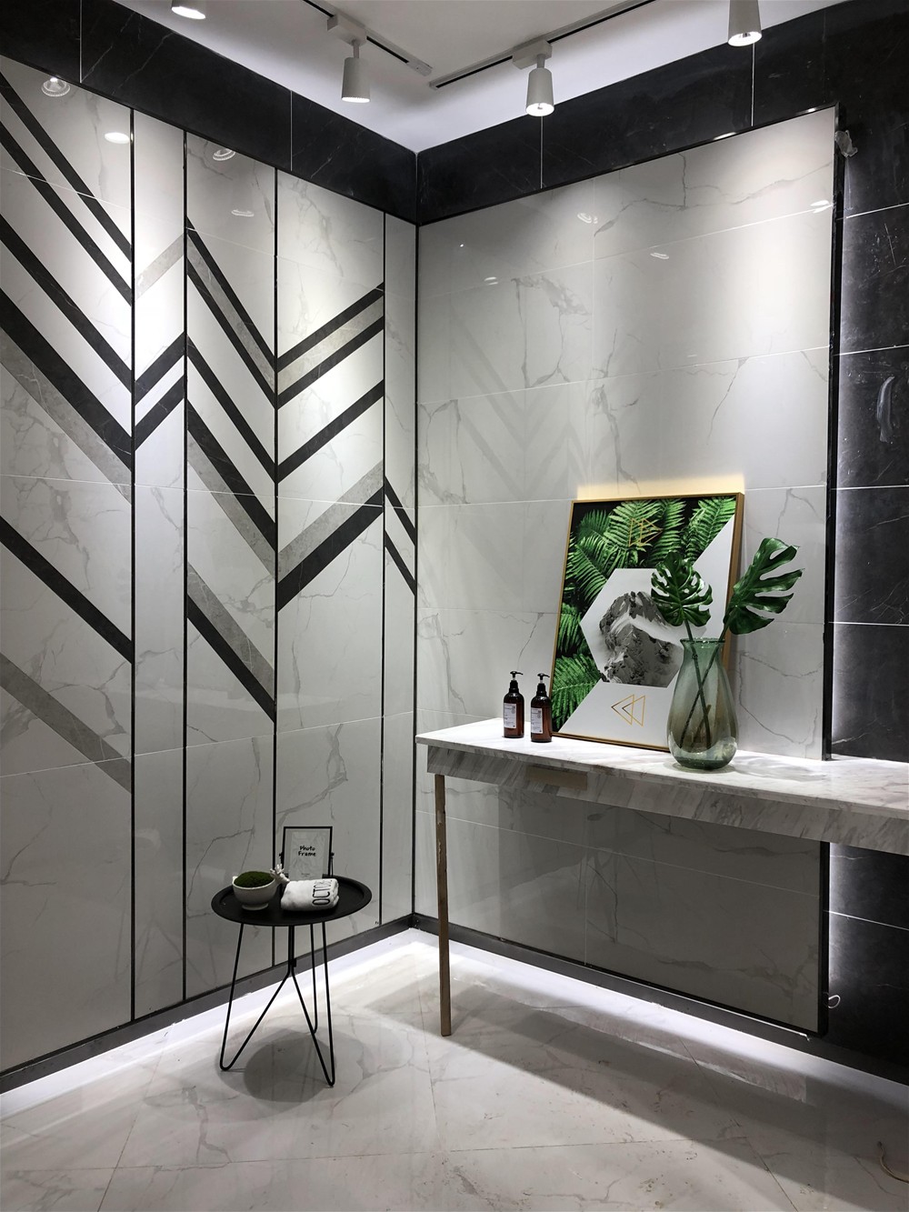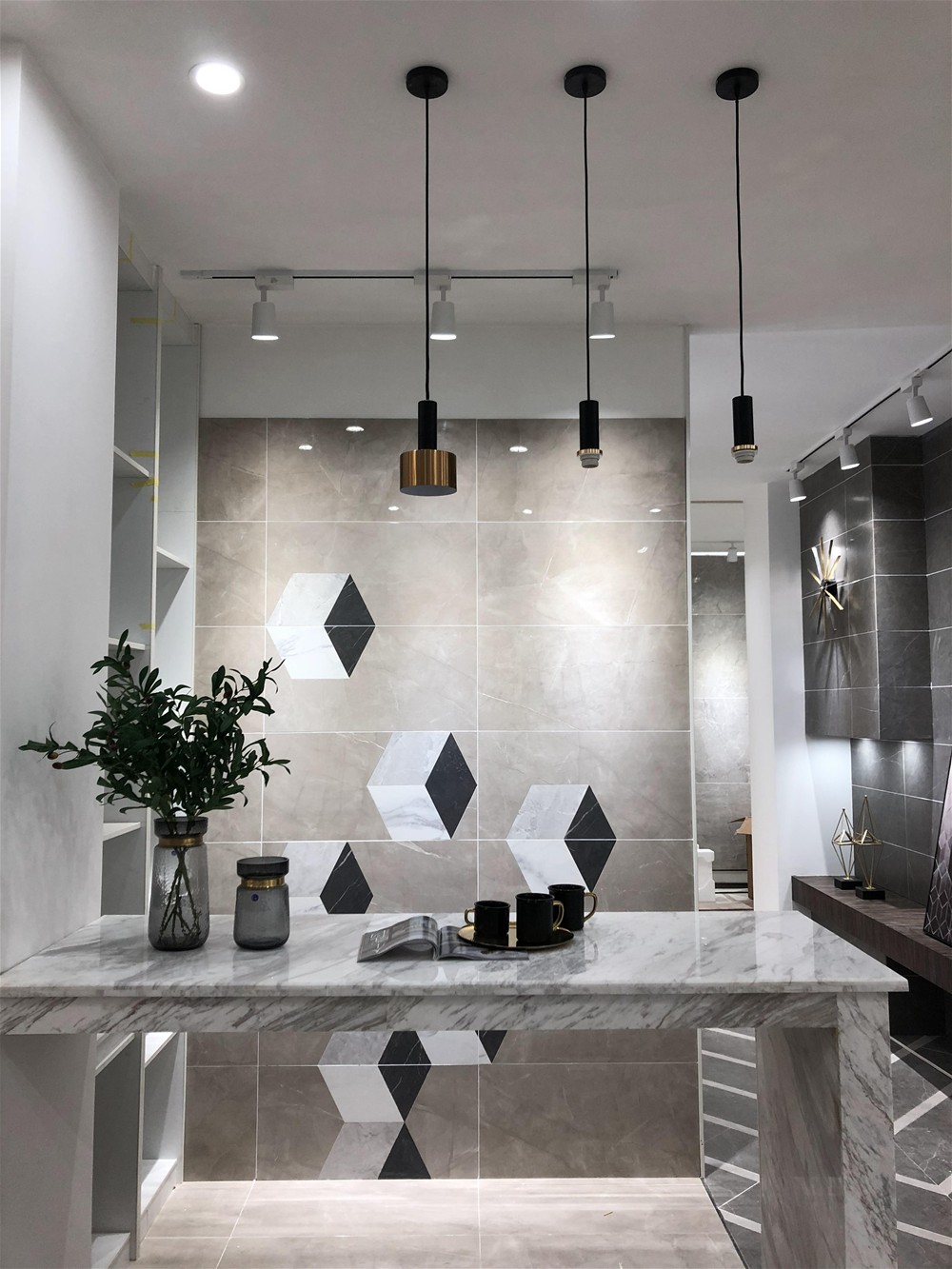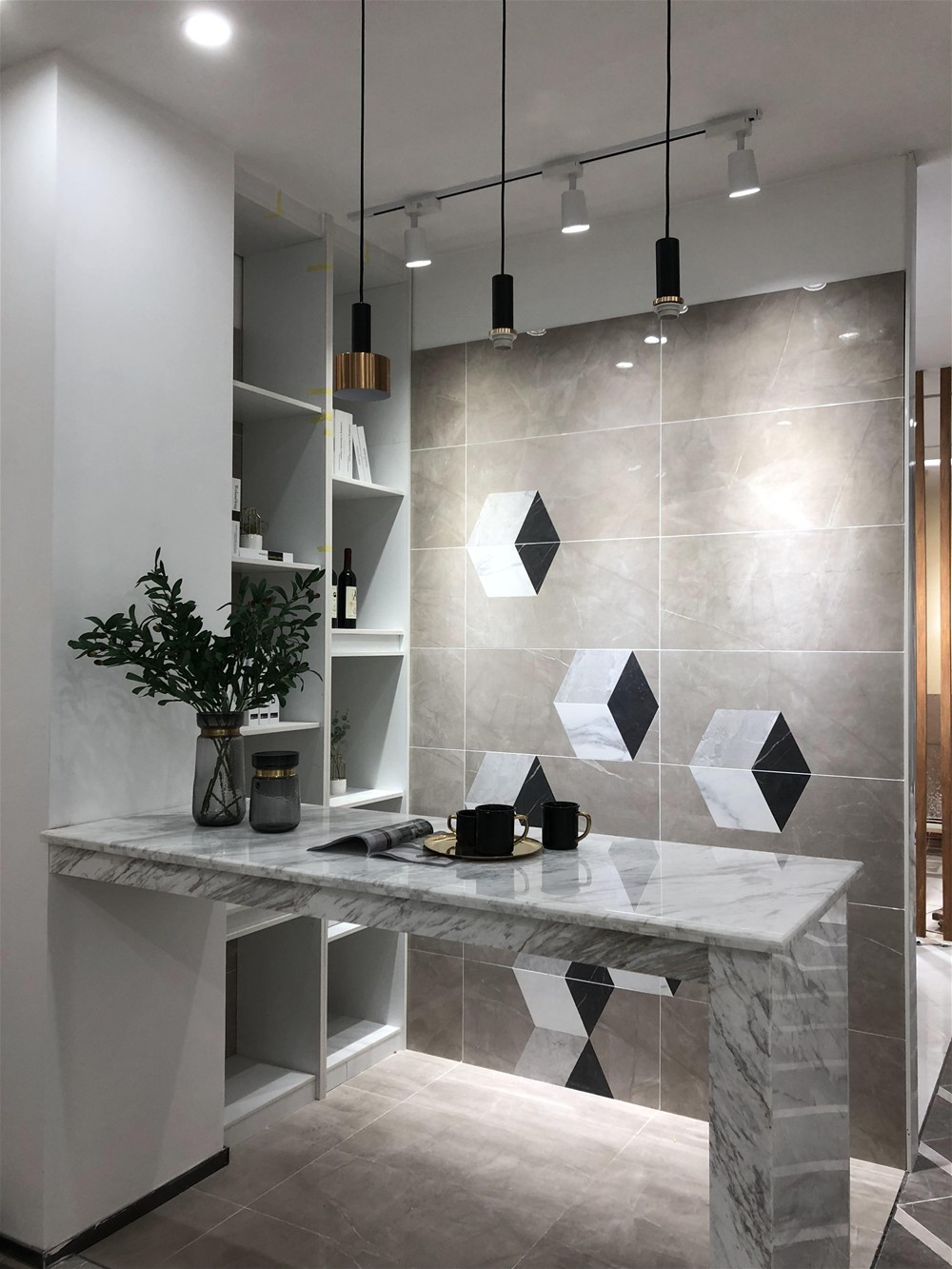 这是吧台模拟间,由九面通体大理石和缎光釉不同规格、产品、颜色铺贴的墙面,个性、时尚,搭配大理石吧台和金属软装,营造出轻奢的质感。
