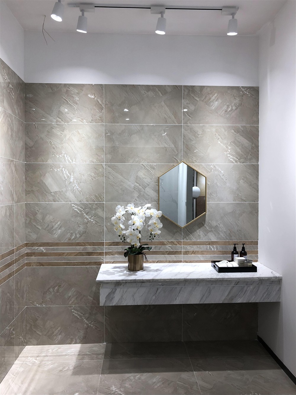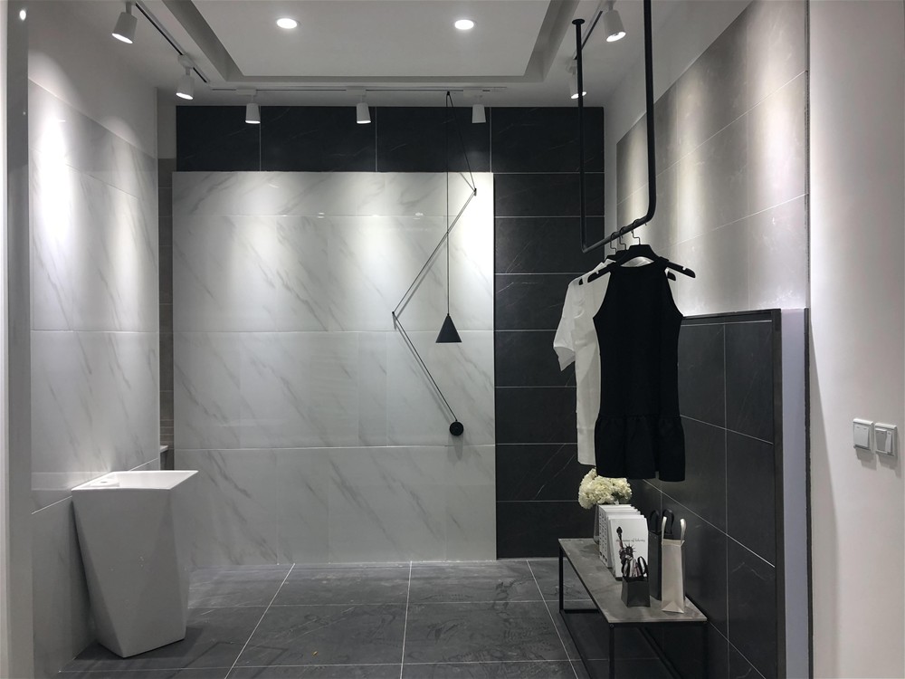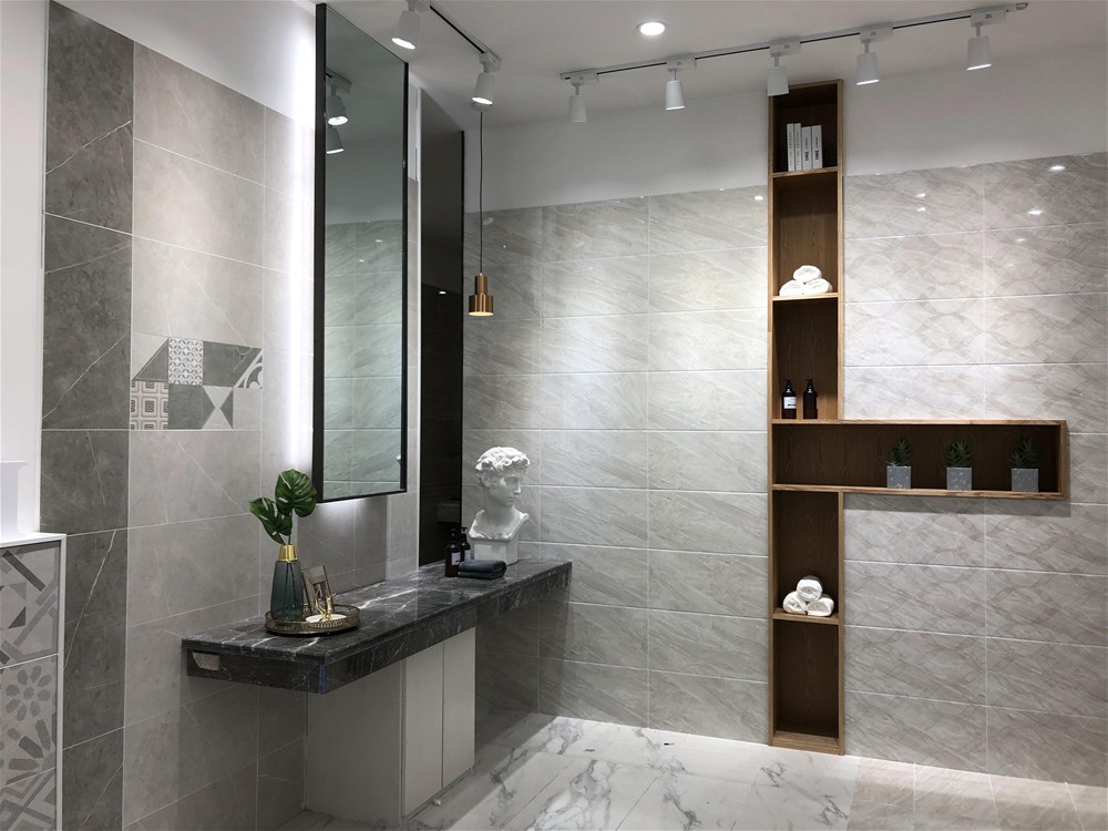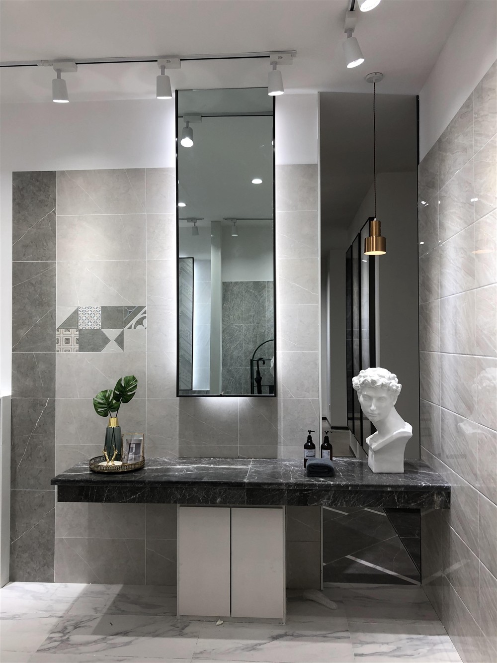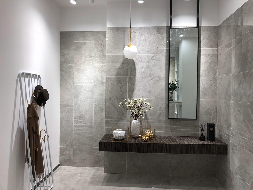这是灰色调的卫生间模拟间,瓷砖选用通体大理石亮面砖,上墙下地都能铺,现代简约风和轻奢风都十分适用。