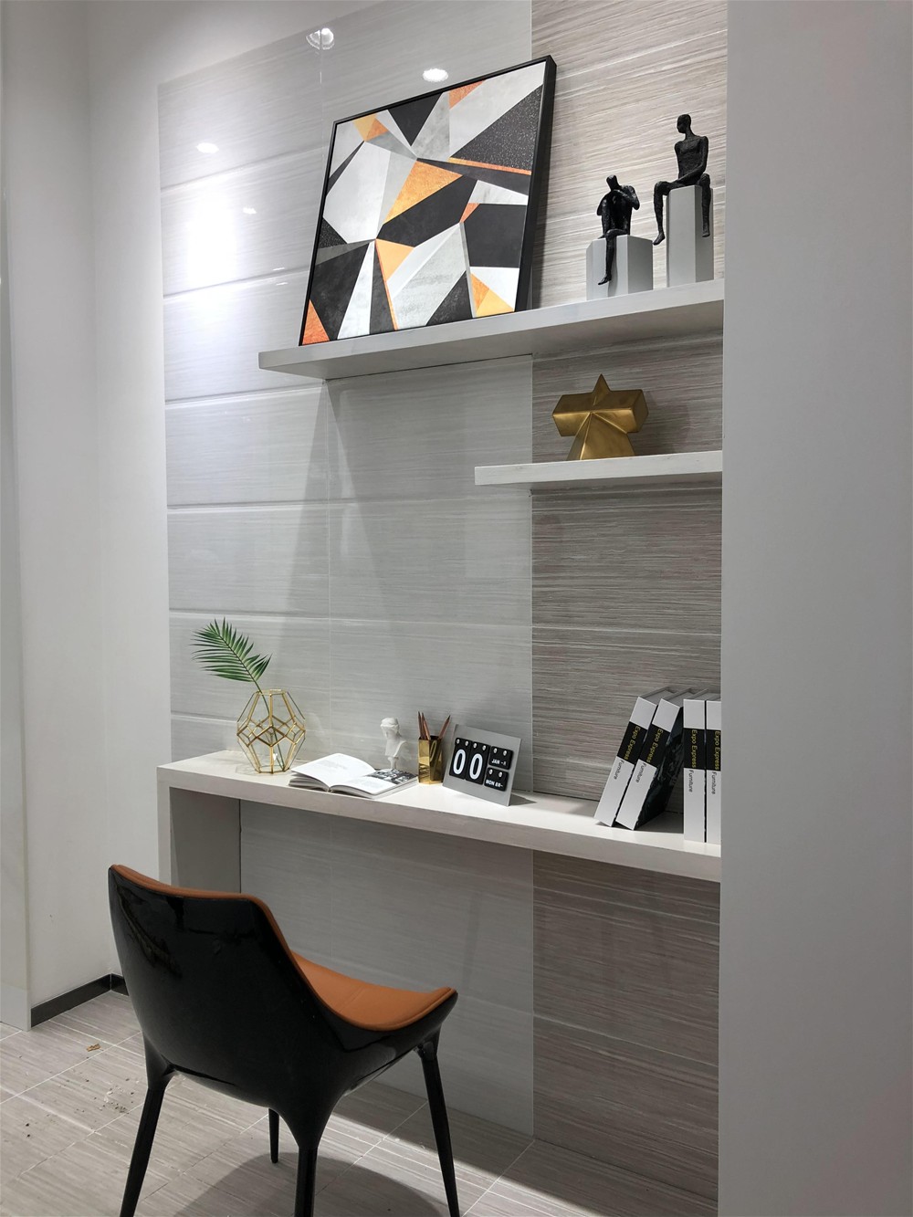 这是由喷墨瓷片铺贴的书房墙面,亮面砖易于打理,砖面线条简洁舒适。