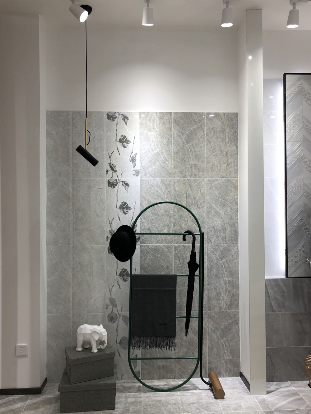 这是现代简约风格衣帽间,前面三款由喷墨瓷片铺贴而成,后面是由缎光釉铺贴,没有过多的切割加工,一深一浅,一素一彩简单搭配,低成本讲究实用性是现代简约风遵循的宗旨。