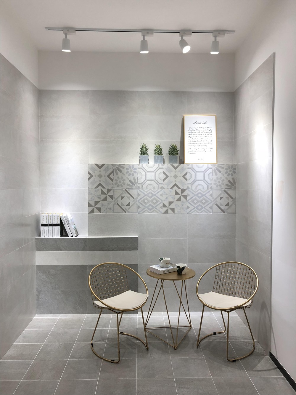 这是阳台、咖啡厅、书房等,主色调以近几年流行的灰色调铺贴,营造简洁、大方、小资的空间,深受年轻人喜欢。
