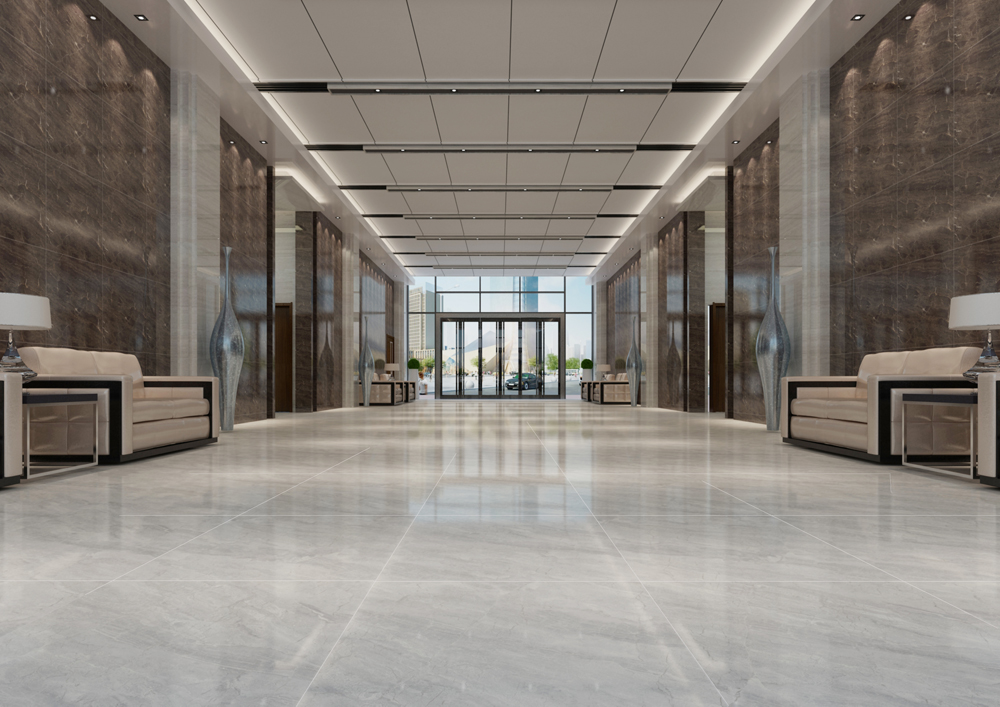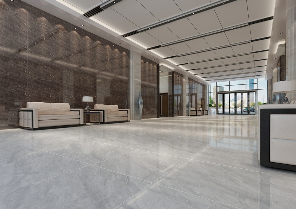 酒店休息区(KTA8301/KTB8110),同样以通体大理石KTA8301/KTB8110铺贴,一深一浅的搭配正好区分墙面和地面,但它们的纹理大致一样,又很好地营造空间的和谐统一。沙发选用与地面接近的颜色,线条简洁大气,在休息区没有流动的线条,设计师用意是想营造休息区的安静氛围。