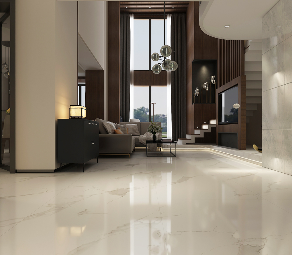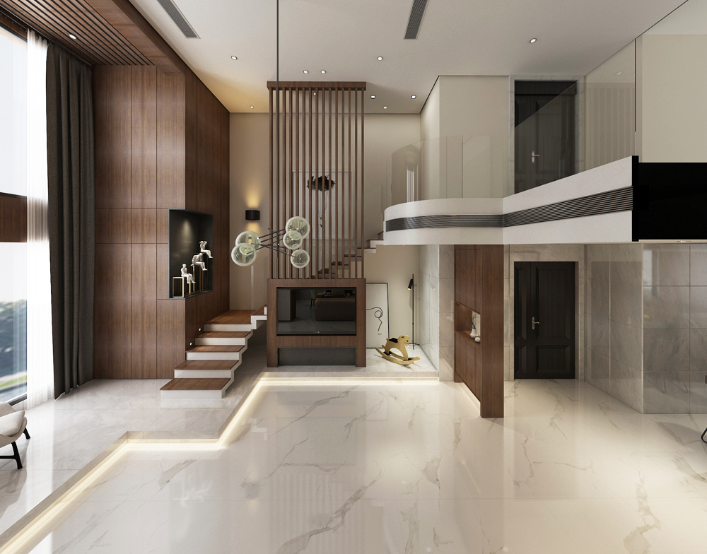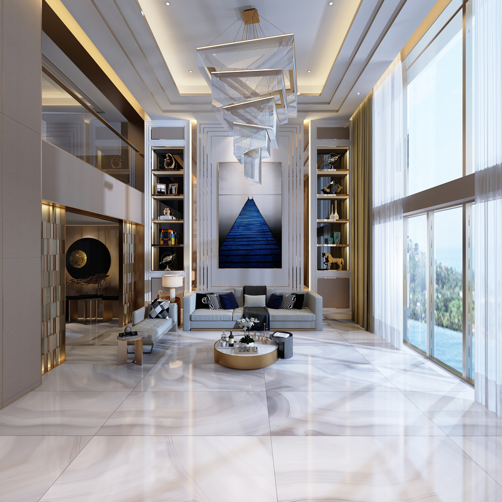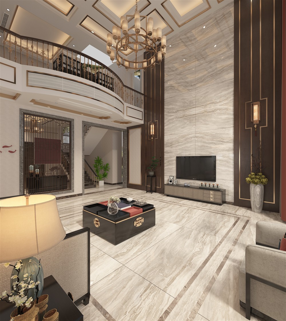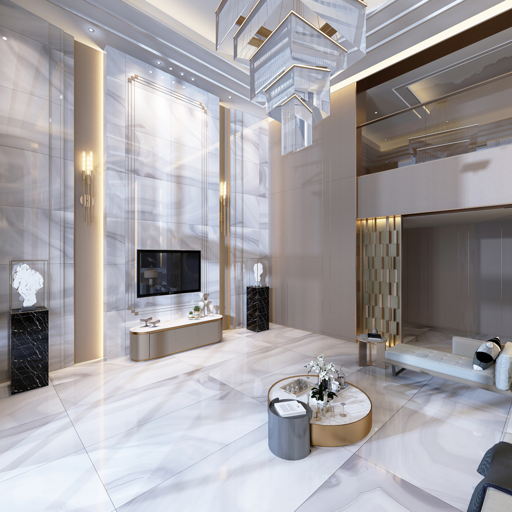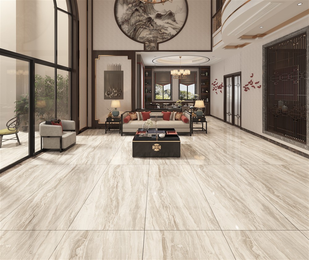 新中式的别墅客厅,砖面飘逸的闪电纹,在大面积铺贴时呈现出更立体、更震撼的视觉效果。和天然石材如出一辙,实现原生态的无边界视觉效果,营造大气、优雅的空间。