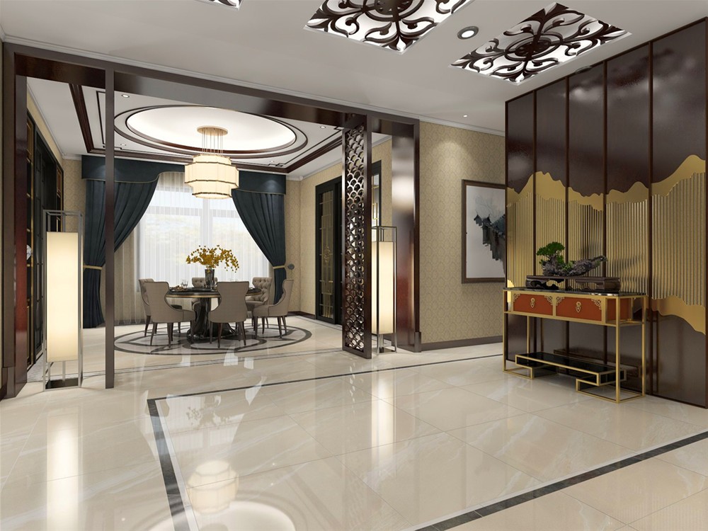 餐厅作为和客厅贯通的空间,利用相协调的深木色酒柜为整墙背景,选择富有中式格调的地砖拼花,象形荷花图案,整体空间呈现素雅而明媚,传统而不失现代,慢慢生出了整个空间的“魂”。让人觉得在此用餐是为乐事!