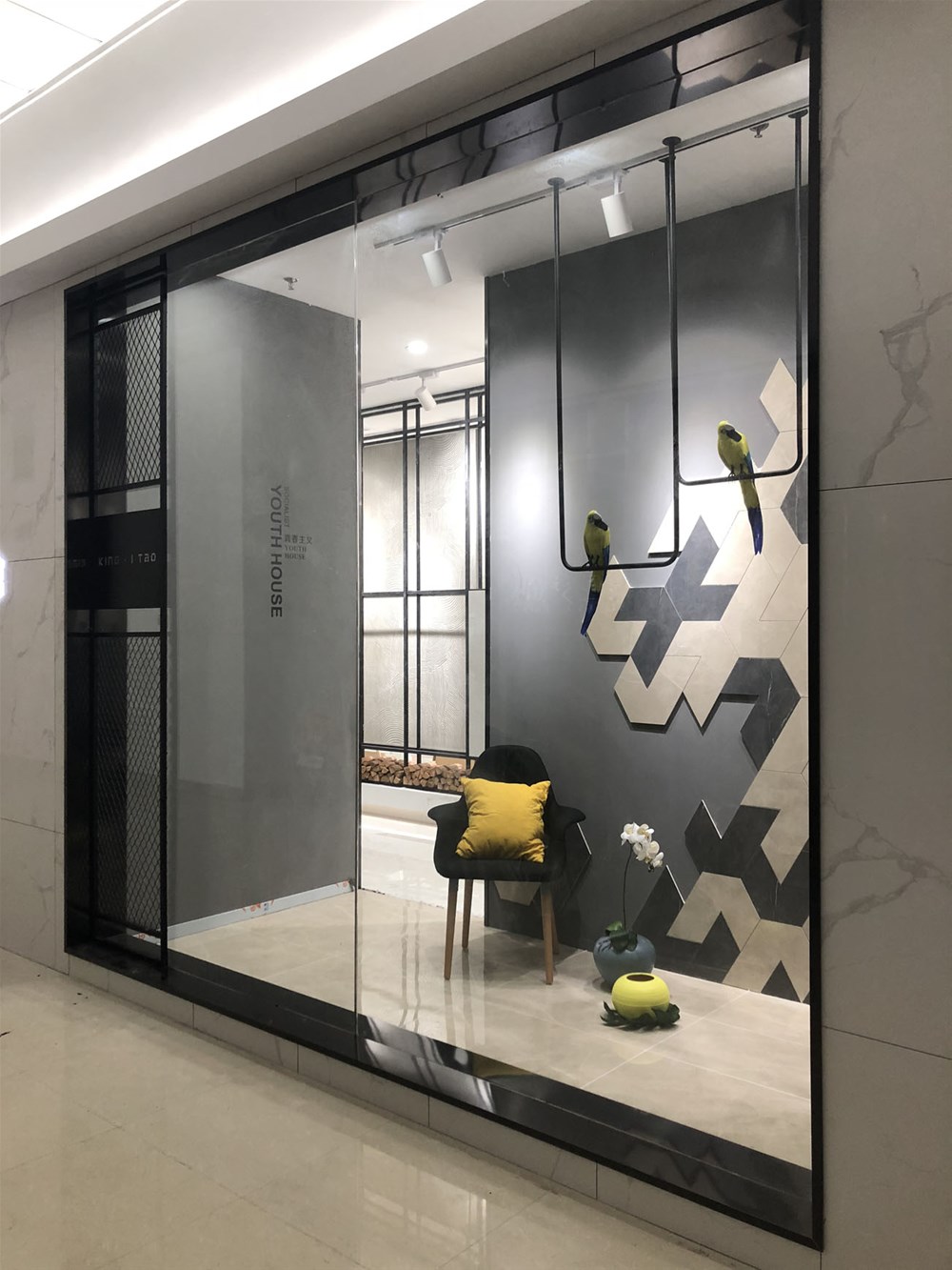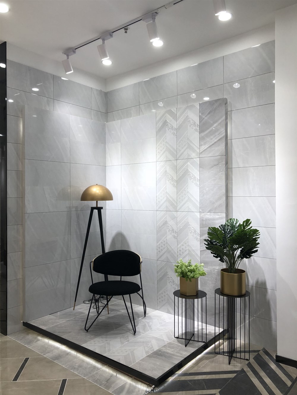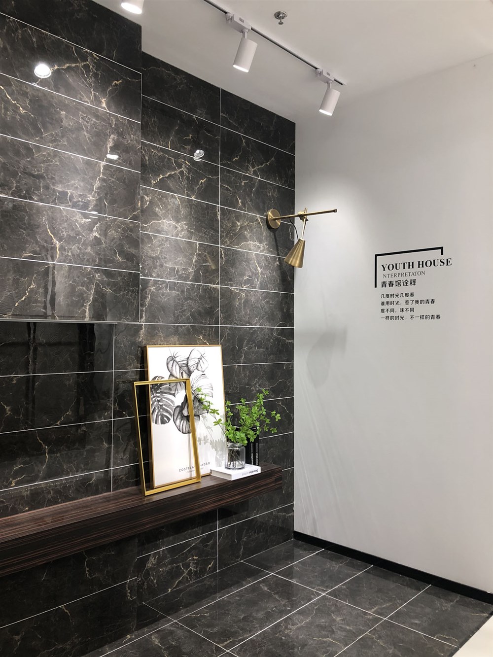 这是轻奢风格阳台、书房的模拟间,由喷墨瓷片铺贴的墙面个性时尚,搭配金属软装营造出轻奢的质感。现在很多流行的咖啡厅参照这样的设计来吸引消费者。