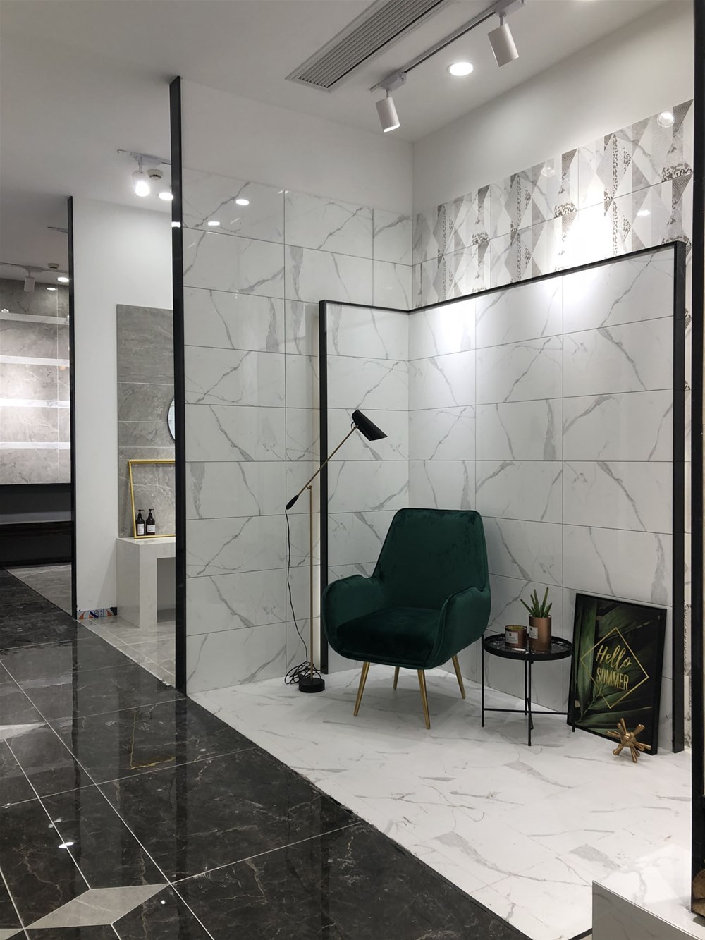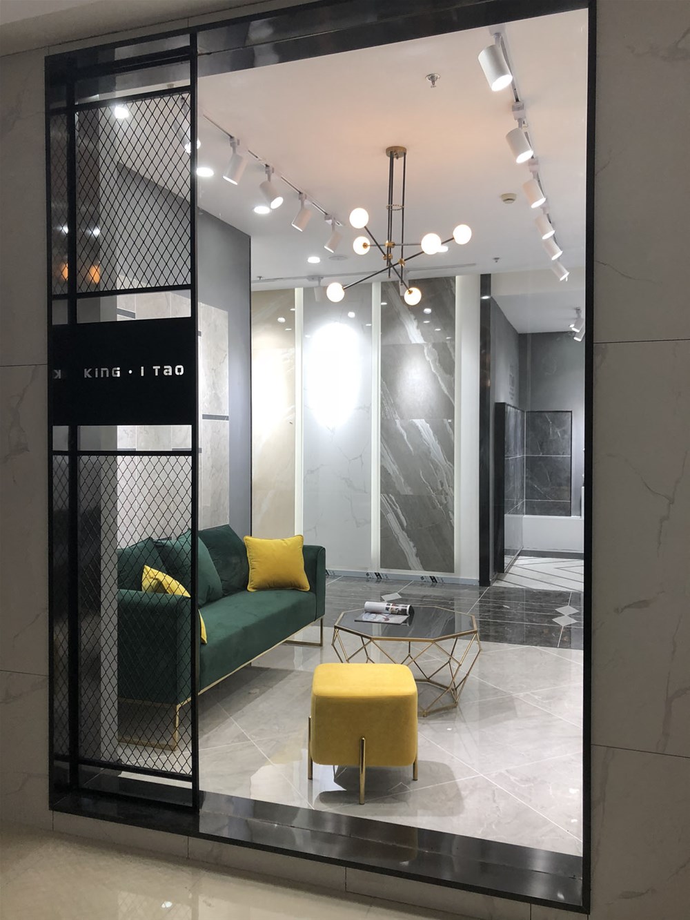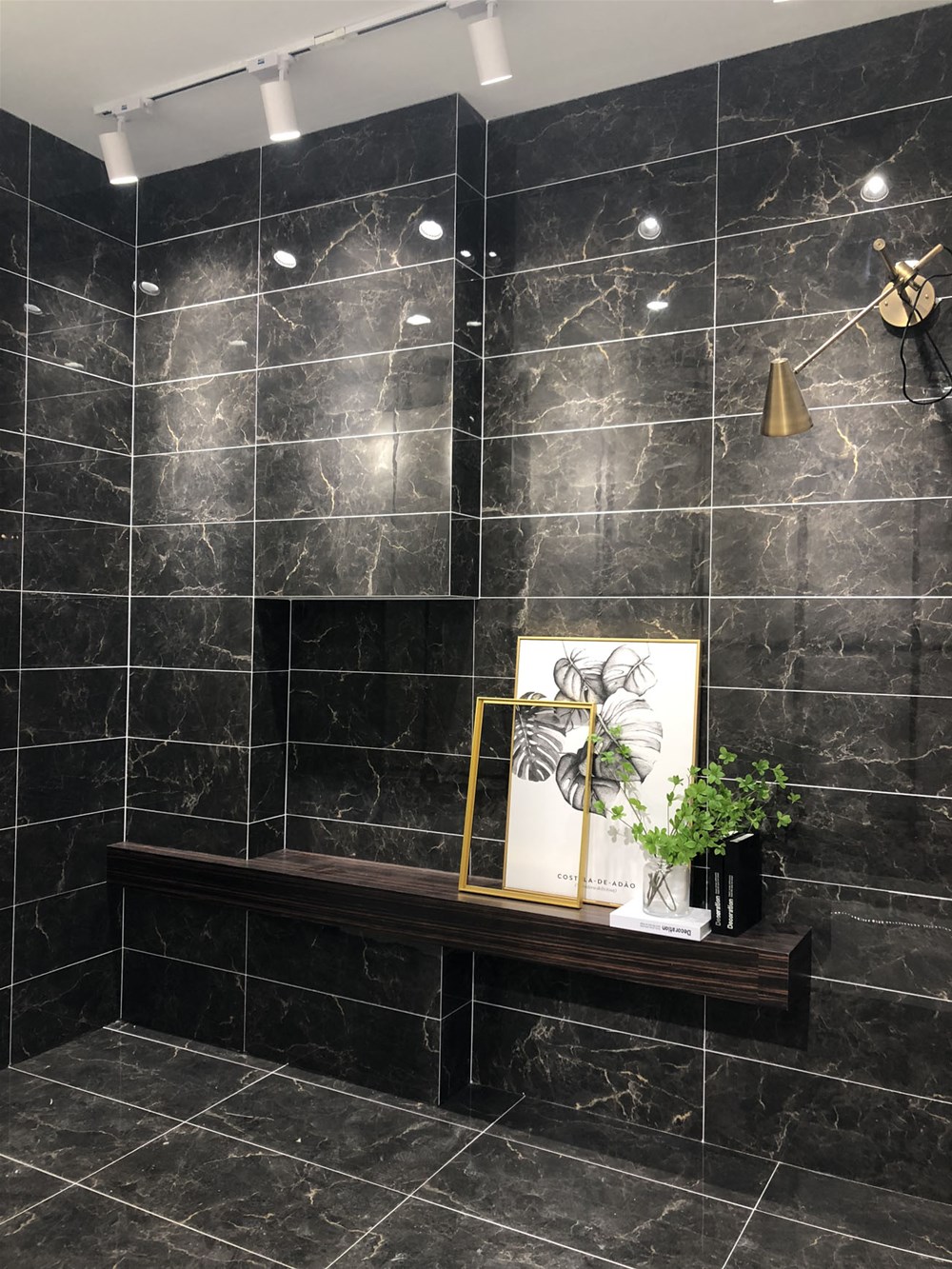 这是轻奢风格阳台、书房的模拟间,由喷墨瓷片铺贴的墙面个性时尚,搭配金属软装营造出轻奢的质感。现在很多流行的咖啡厅参照这样的设计来吸引消费者。