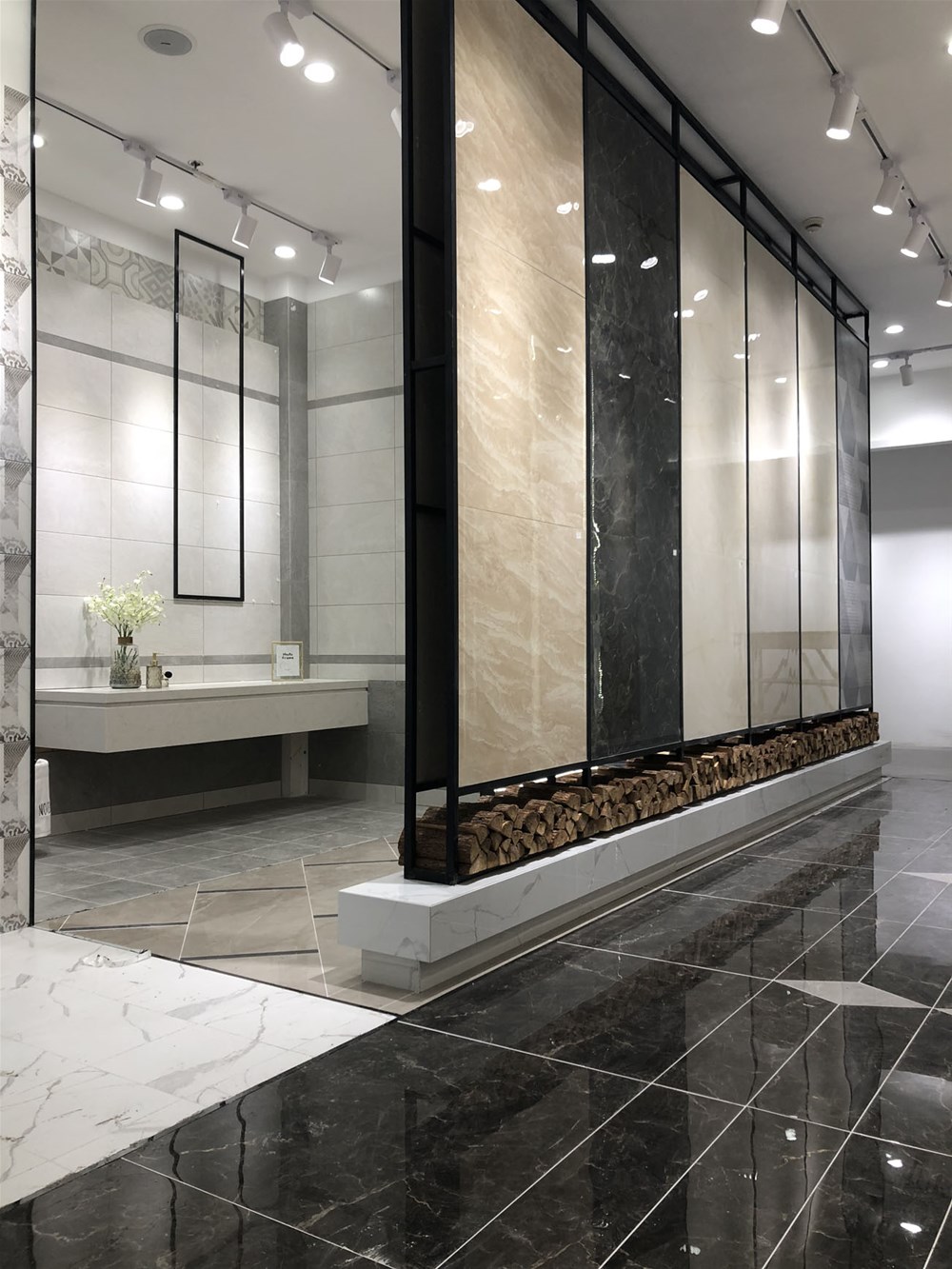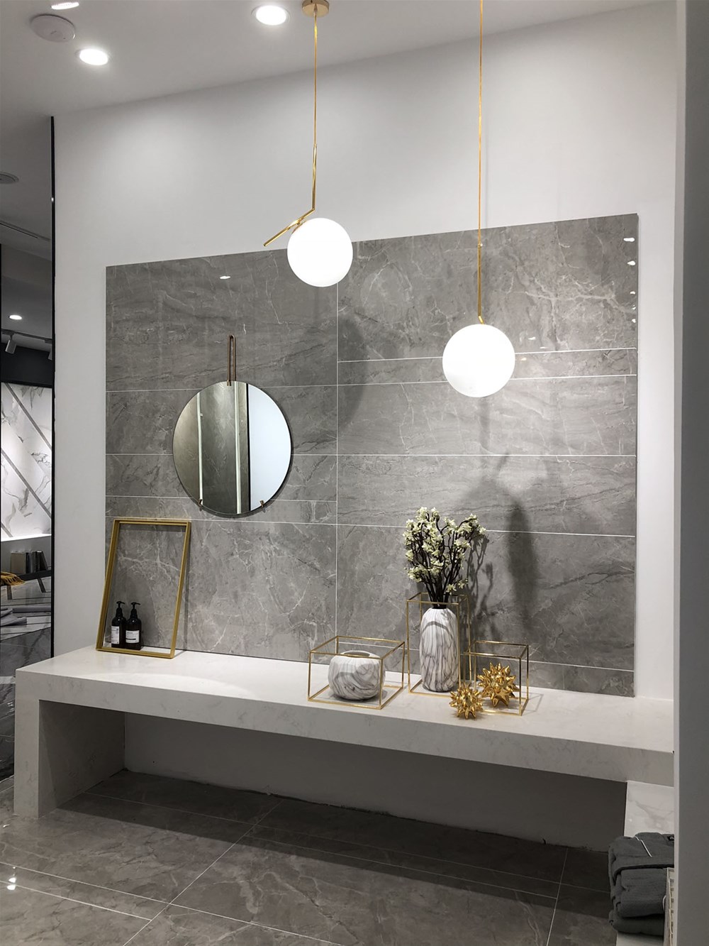 这是香蕉APP直播陶浙江湖州青春馆的形象台和形象墙,上图由灰色九面通体大理石铺贴的前台背景墙,可作电视背景墙和客厅地砖铺贴使用。