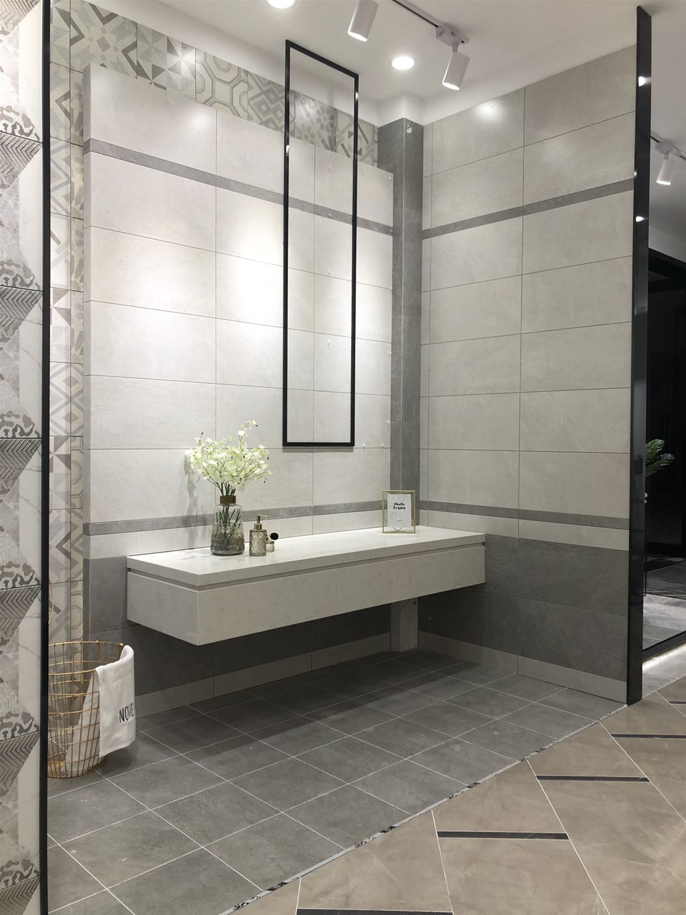 这是由喷墨瓷片铺贴的现代简约卫生间,简单的铺贴方式没有过多的造型,一深一浅搭配出层次感,花片恰到好处的使用,简约而不简单。