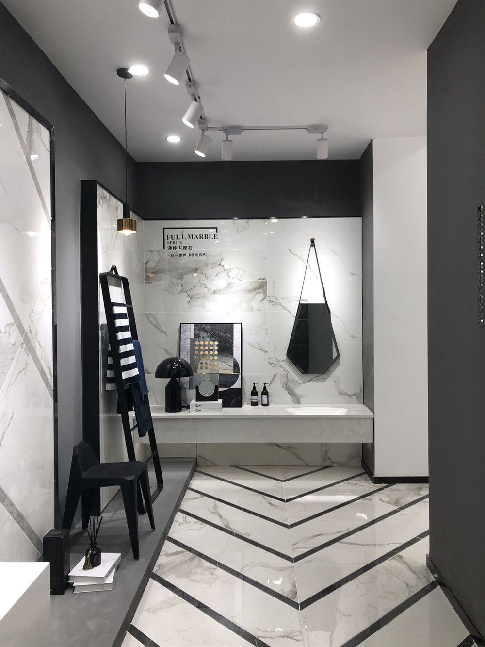 这是由九面通体大理石铺贴的现代简约卫生间墙面,亮面砖易于打理,搭配线条简洁的软装,深受年轻消费者喜爱。