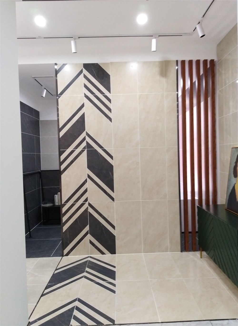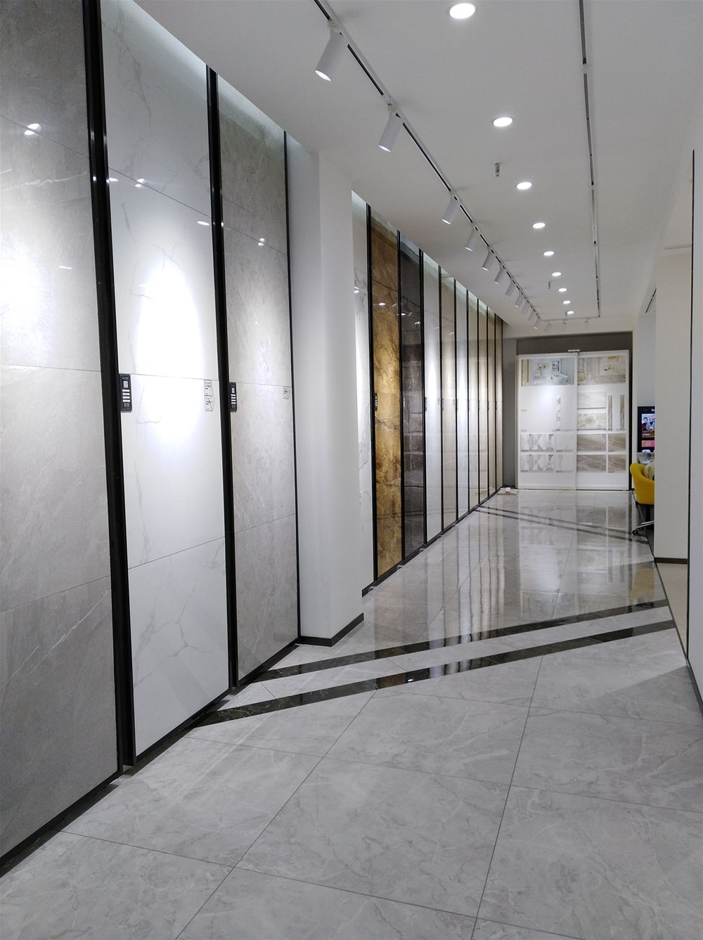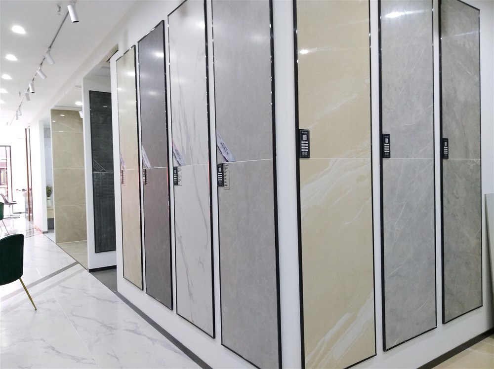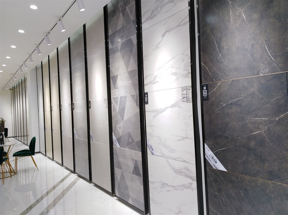 这边走,这是香蕉APP直播的选材区,规格、款式、风格一应俱全,通过射灯照射下的砖面纹理是不是清晰多了?如果您现在还不知道自己要选什么产品,看完香蕉APP直播的模拟间你或许就能找到方向了。