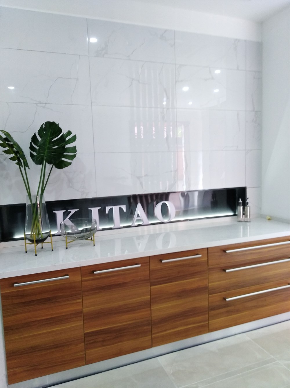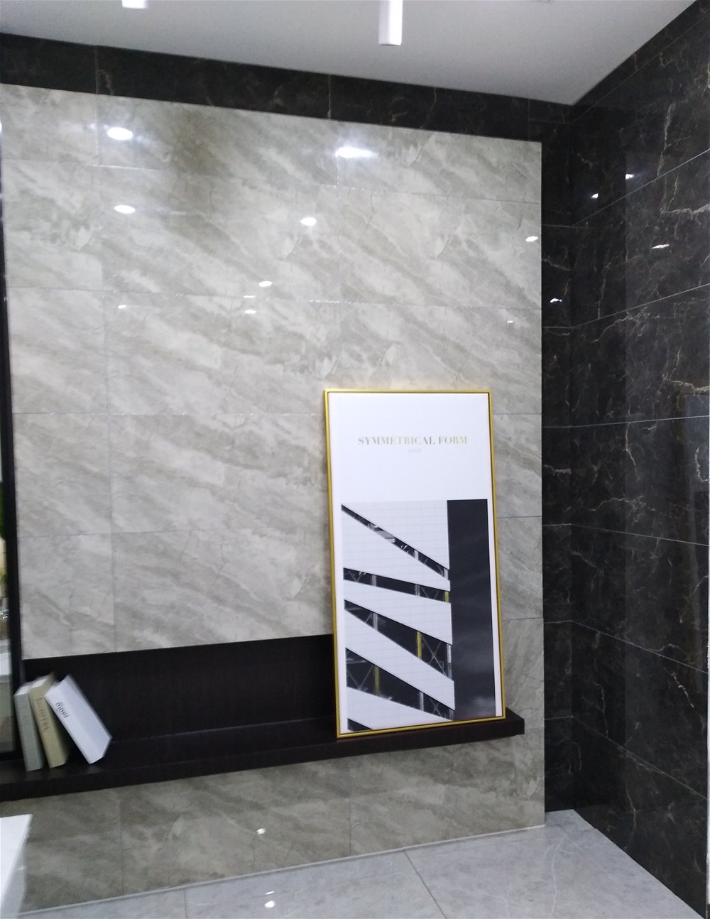 这是香蕉APP直播的前台,背景墙由九面通体大理石KA9M61209尼泊尔灰单独铺贴,大气、简洁,这款砖也非常适合客厅电视背景墙、地面铺贴使用,不知道您觉得怎么样呢?
