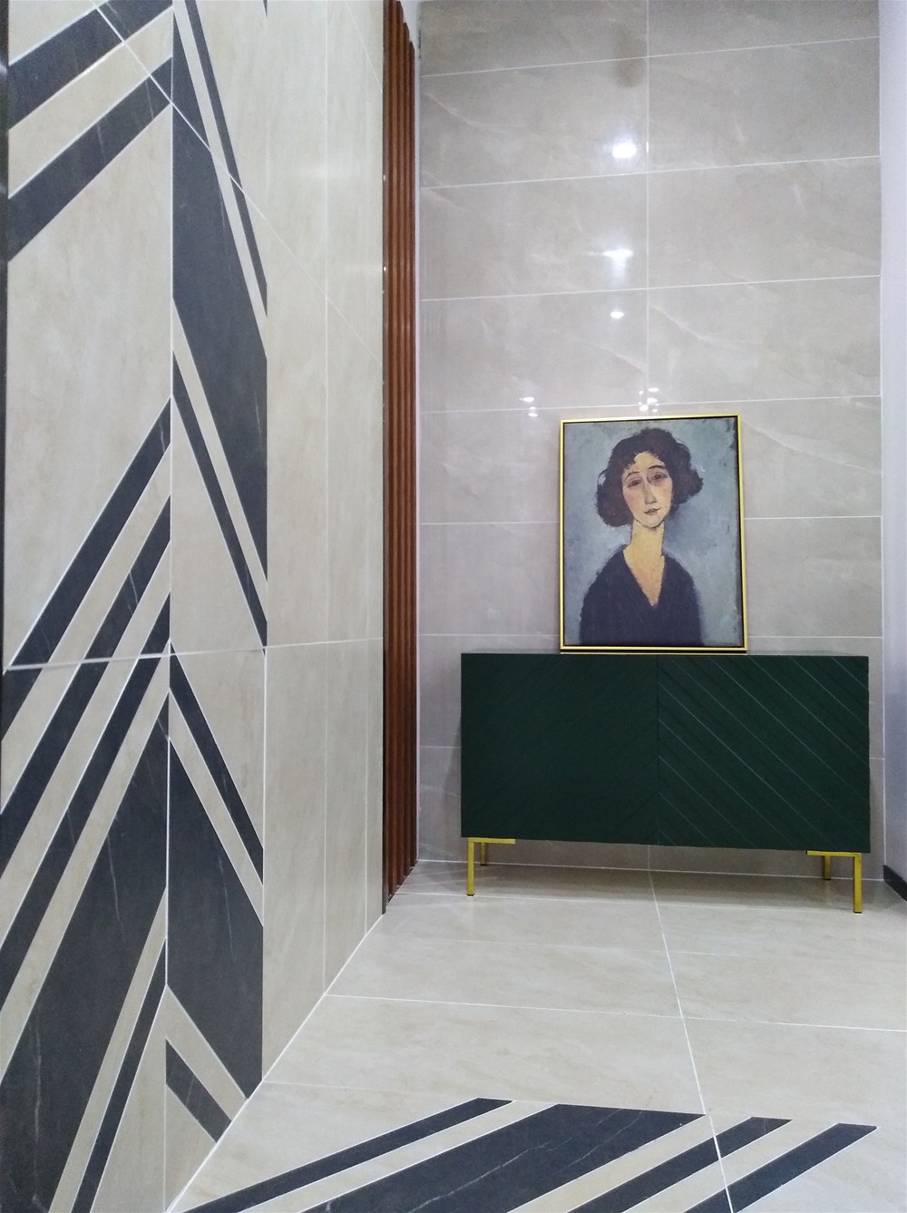 这是现代简约风格玄关,正面墙由通体大理石KT9832凯罗地灰铺贴,玉石的质感温润细腻,侧面墙则由15°缎光釉KFD8803泰坦米黄与KFD8808保级利亚灰切割铺贴,正面正铺与侧面墙切割铺贴,繁与简结合,亮面与柔光面搭配,不会造成视觉疲劳又不至于太单调。