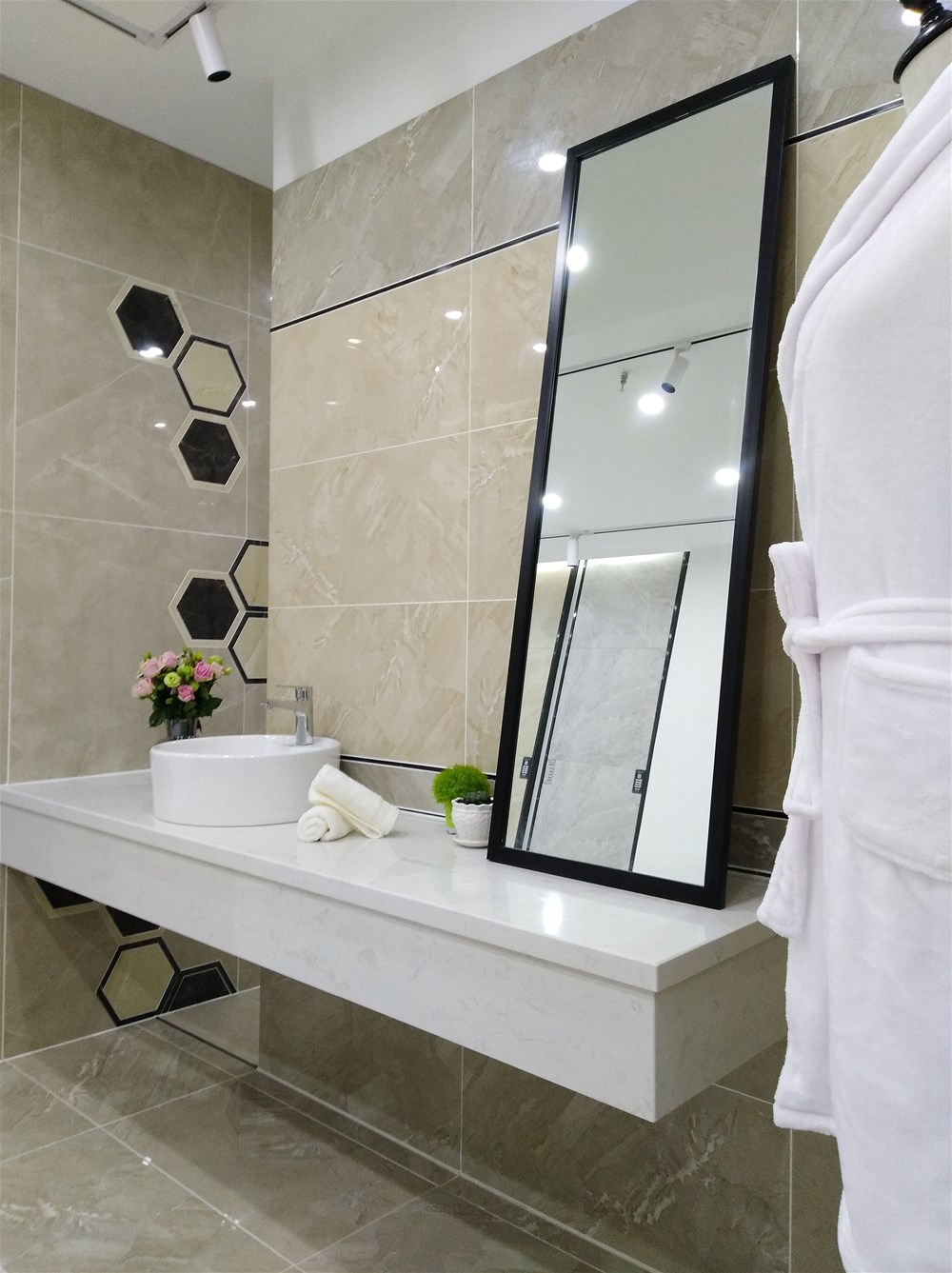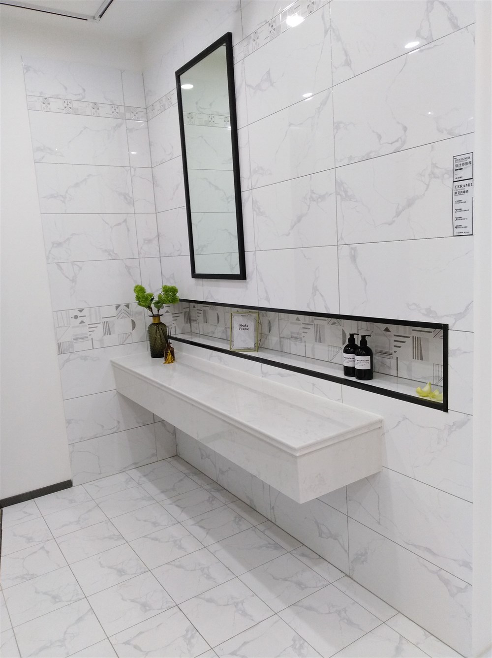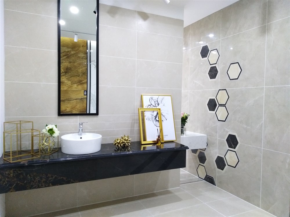 这就是香蕉APP直播公司配套的喷墨瓷片,也是香蕉APP直播店的明星产品,小地砖、花片、腰线一系列搭配,适用于厨卫、阳台等区域,空间面积虽小,但是铺设白色整体看起来就宽敞洁净多了,砖面纹理大气、自然、舒适,不知道您感受如何呢?很多年轻消费者都非常喜欢香蕉APP直播这款产品呢!