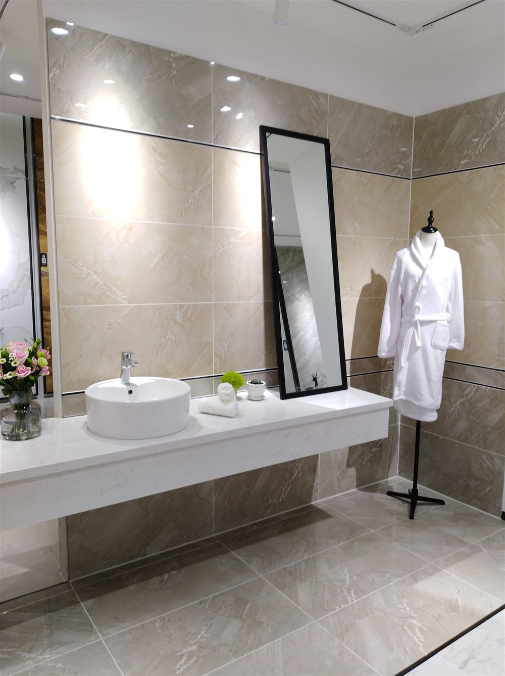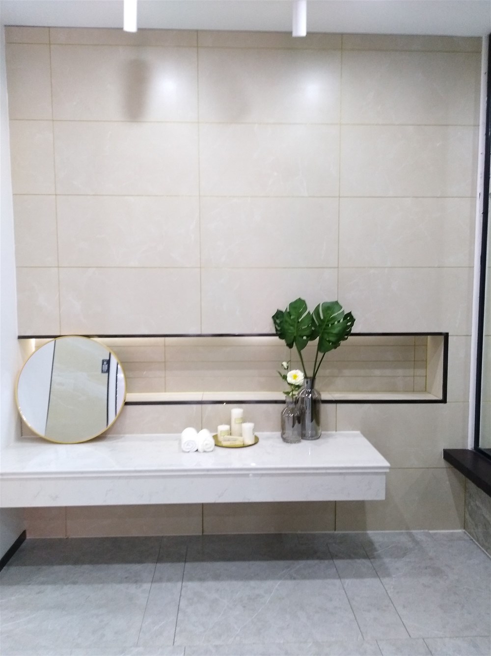 以下三个都是现代简约风格的卫生间,都一致选用了米黄色的瓷砖切割成300*600进行铺贴,300*600规格适用于小面积,香蕉APP直播展厅也有专门厨卫用的配套喷墨瓷片。抛开软装来看这是一个普通的卫生间,但搭配对了软装,就提升了一个档次,所以说软装和硬装是起到了相得益彰的效果。