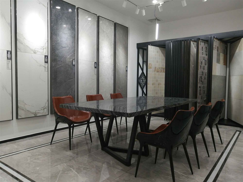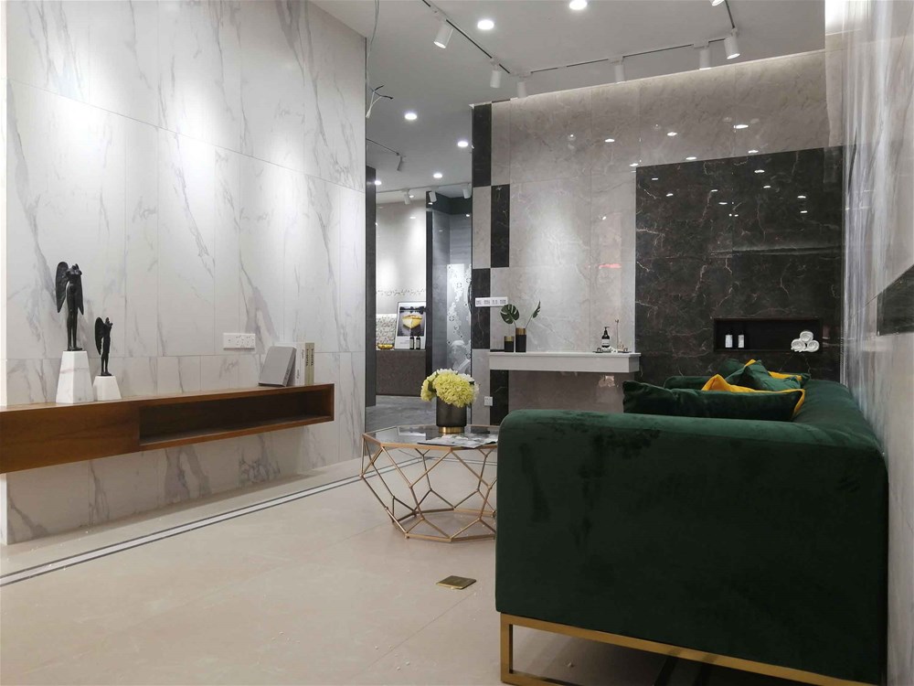 往里边走,这是香蕉APP直播的选材区,这里集合了200多个瓷砖花式,有通体大理石、15°缎光釉、喷墨瓷片、瓷抛砖、艾釉石、仿古砖等,喷墨瓷片都是配套产品,这边拉开来就能直观看到它的铺贴效果。您再看,地面也是灰色瓷砖铺贴的效果,您家客餐厅都适合这样铺设的。