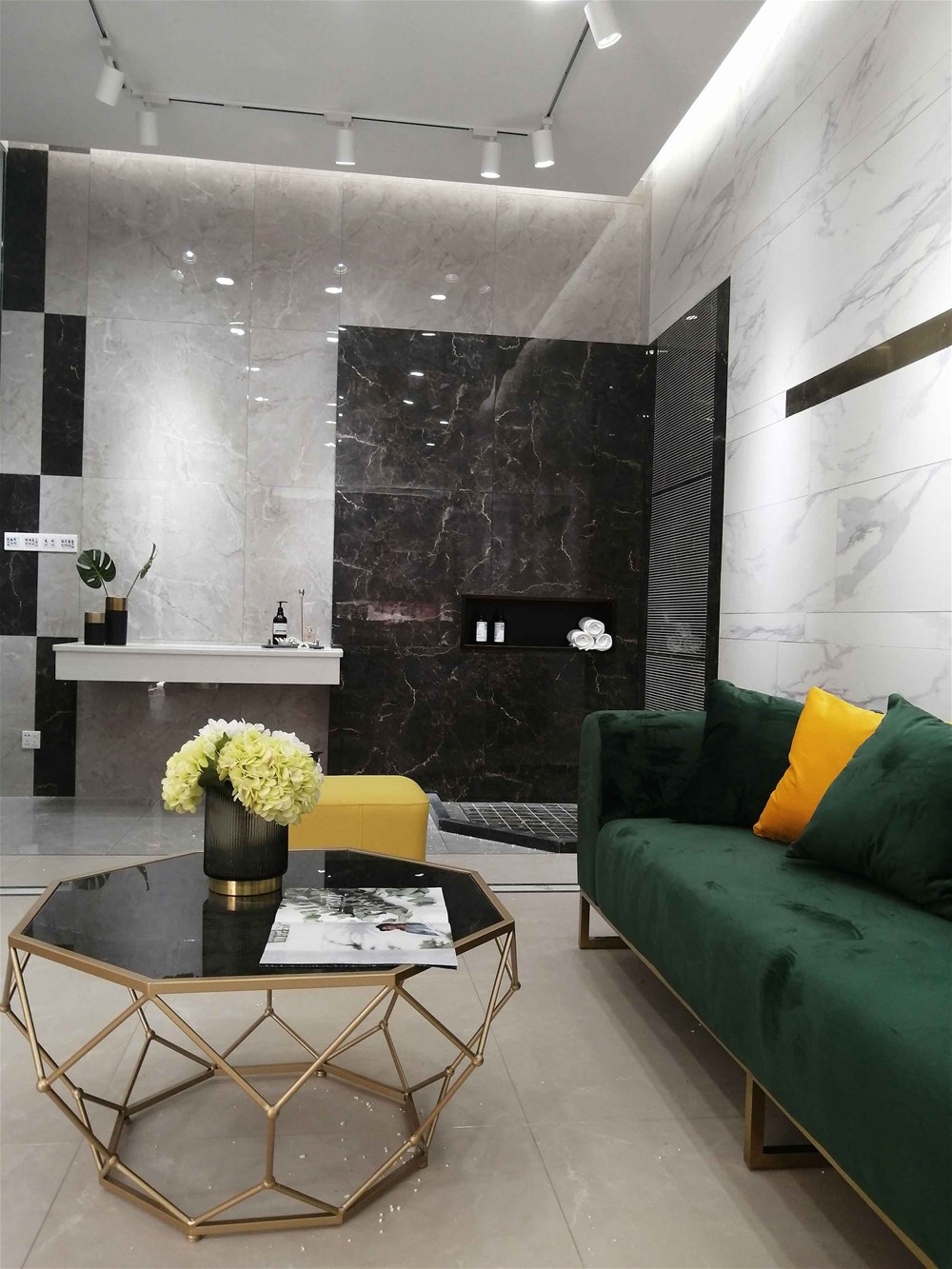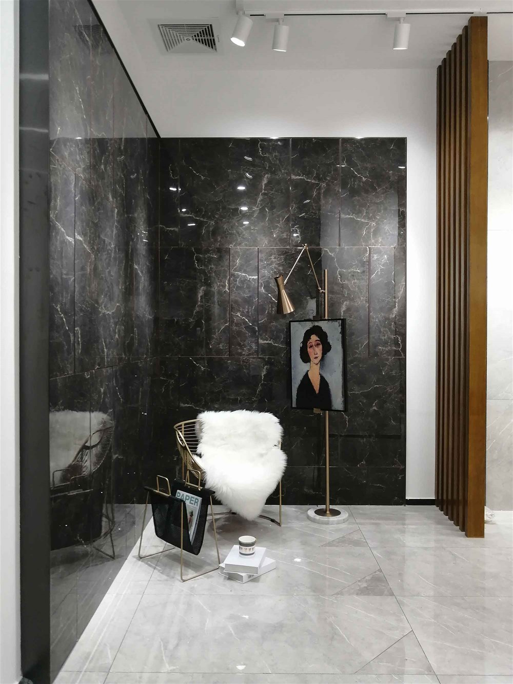 这是由通体大理石KTB9818达曼深咖铺贴的轻奢阳台或咖啡厅墙面,地面则由九面通体大理石KA9M61207切割铺贴,设计师巧妙运用600*1200规格产品切割一个角又拼合的方式,赋予空间个性独特的魅力,十分符合年轻人的品味。这两款砖用于电视背景墙、各空间地面都是可以的。
