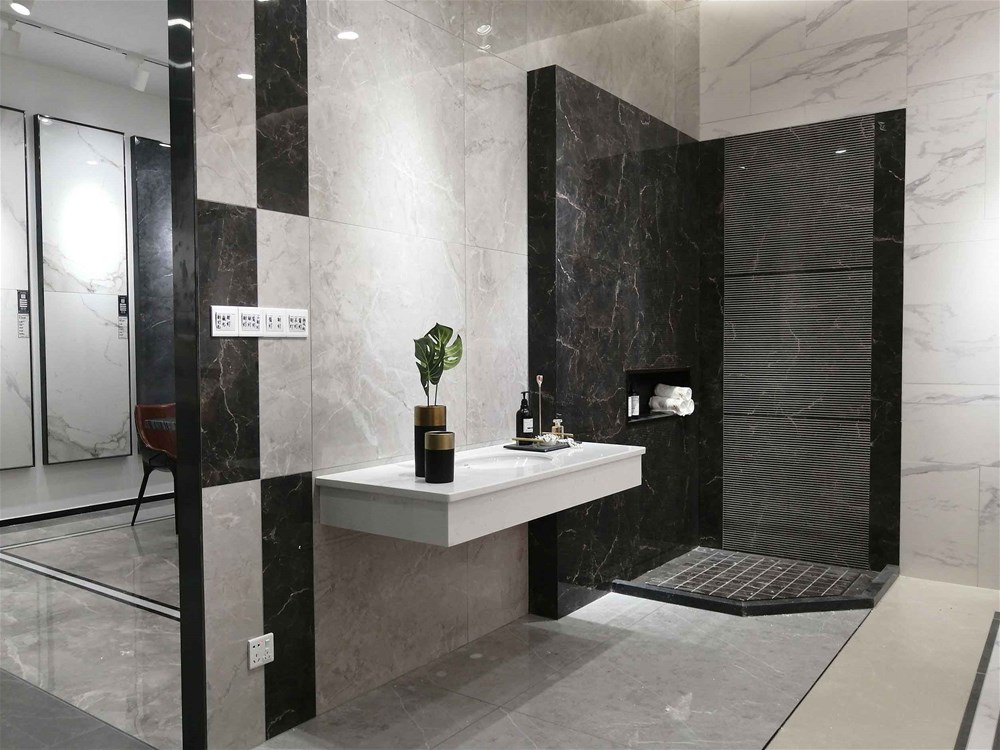 这是由通体大理石KTB9818达曼深咖和KA9M61209尼泊尔灰搭配铺贴的卫生间,卫生间是比较私密的空间,选用深色砖隔开淋浴区域,最适合不过,砖面纹理自然逼真不会显得太过深沉,很多高级酒店设计都是这样的,这两款砖同样适用于地面铺贴。