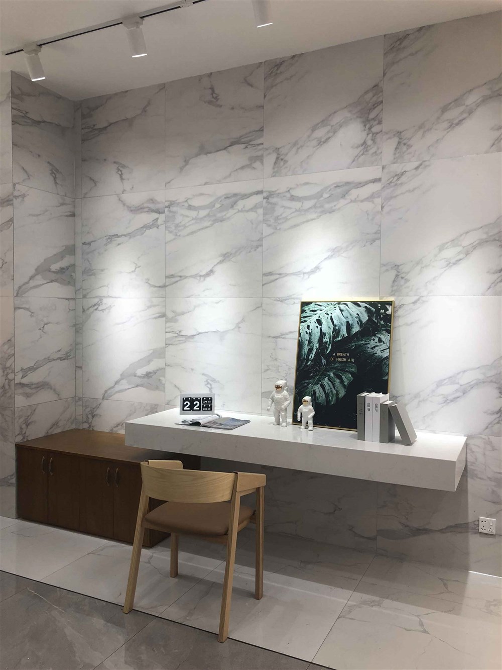 这也是15°缎光釉KFD8801卡拉卡白铺设的现代简约书房,书房、电视背景墙选用缎光釉都能起到一定的护眼作用,是目前很多消费者的首选,喜欢的产品都能先把型号记下来哦!