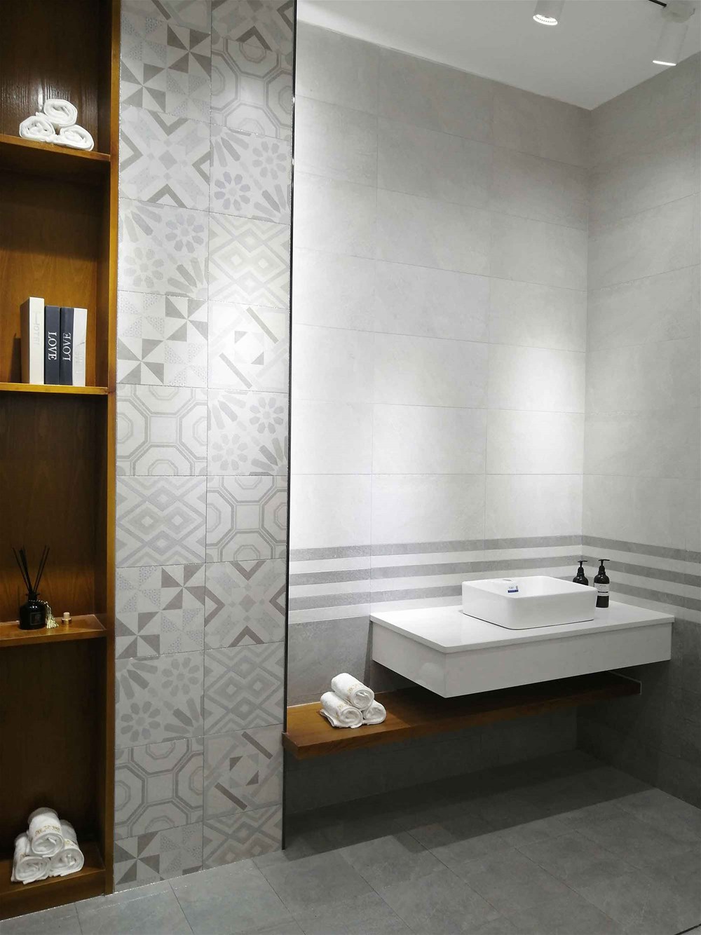 这是由喷墨瓷片KPM36081系列产品铺贴的卫生间,现代简约时尚耐看,地面是防滑的小地砖,十分符合卫生间需求,整个空间都是灰色瓷砖也不会单调,有花片的衬托个性又独到,您家卫生间也可以考虑这样设计哦!