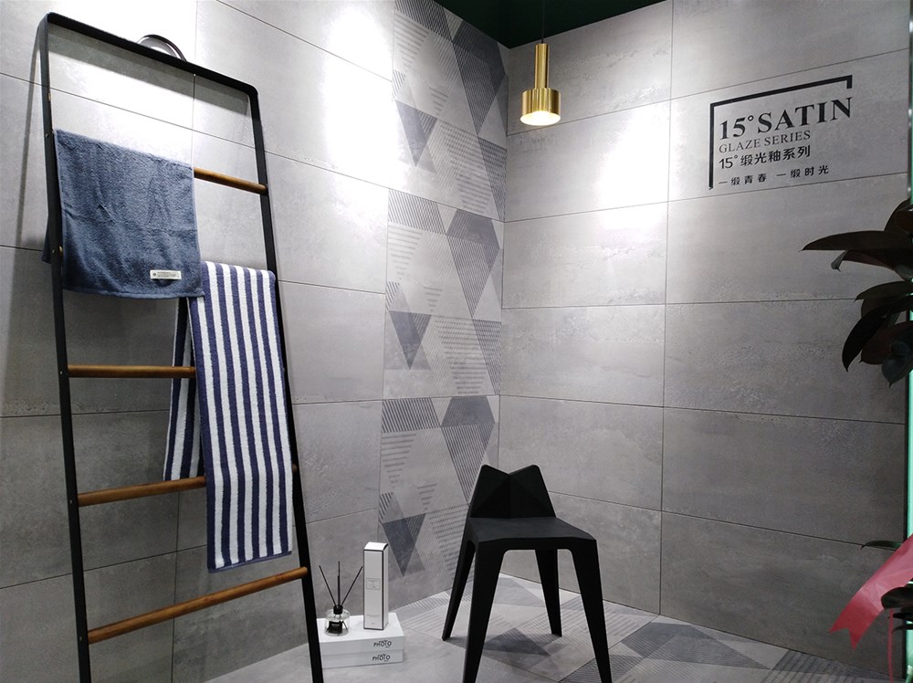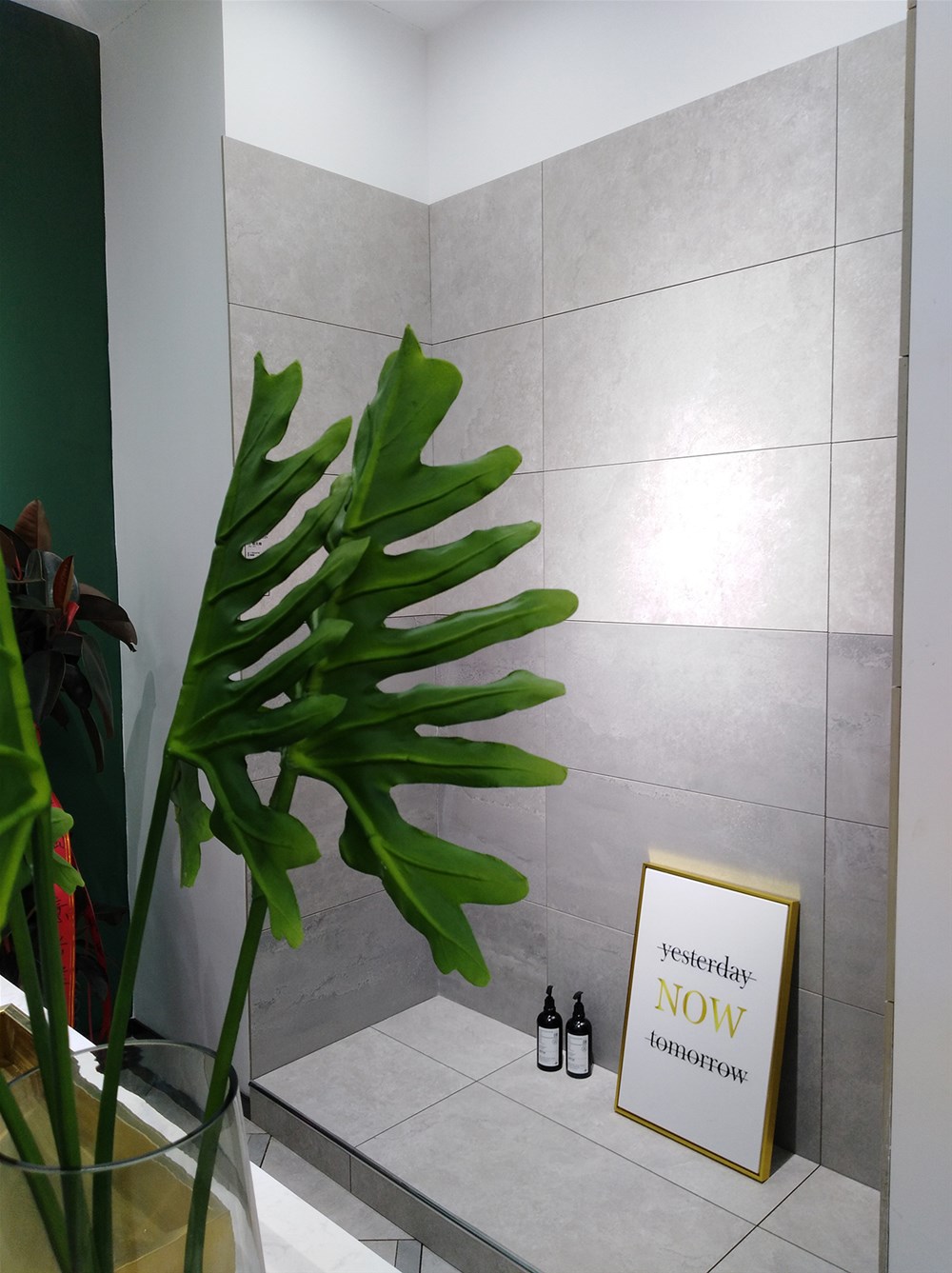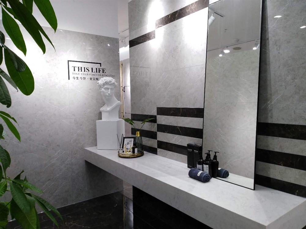 这是由15°缎光釉KFD8805奥斯曼灰与KFD8806银线灰洞加工成400*800规格拼铺的现代简约卫生间,深与浅的过渡,砖面纹理斑驳,散发出复古的气息,作为卫生间用砖不仅耐脏且起到很好防滑作用。用到阳台、厨房等区域同样能完美绽放。