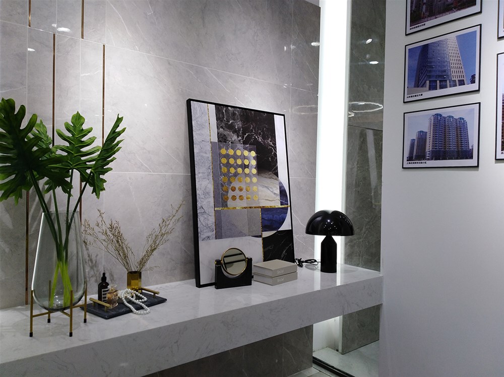 这是前台接待区,背景墙选用网红规格600*1200mm尼泊尔灰KA9M61209通铺,简洁中不失优雅的一款灰色调瓷砖,这款产品铺贴到你家电视背景墙、客餐厅地砖同样适合。不知道您觉得怎么样?
