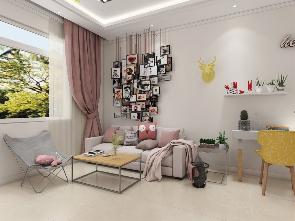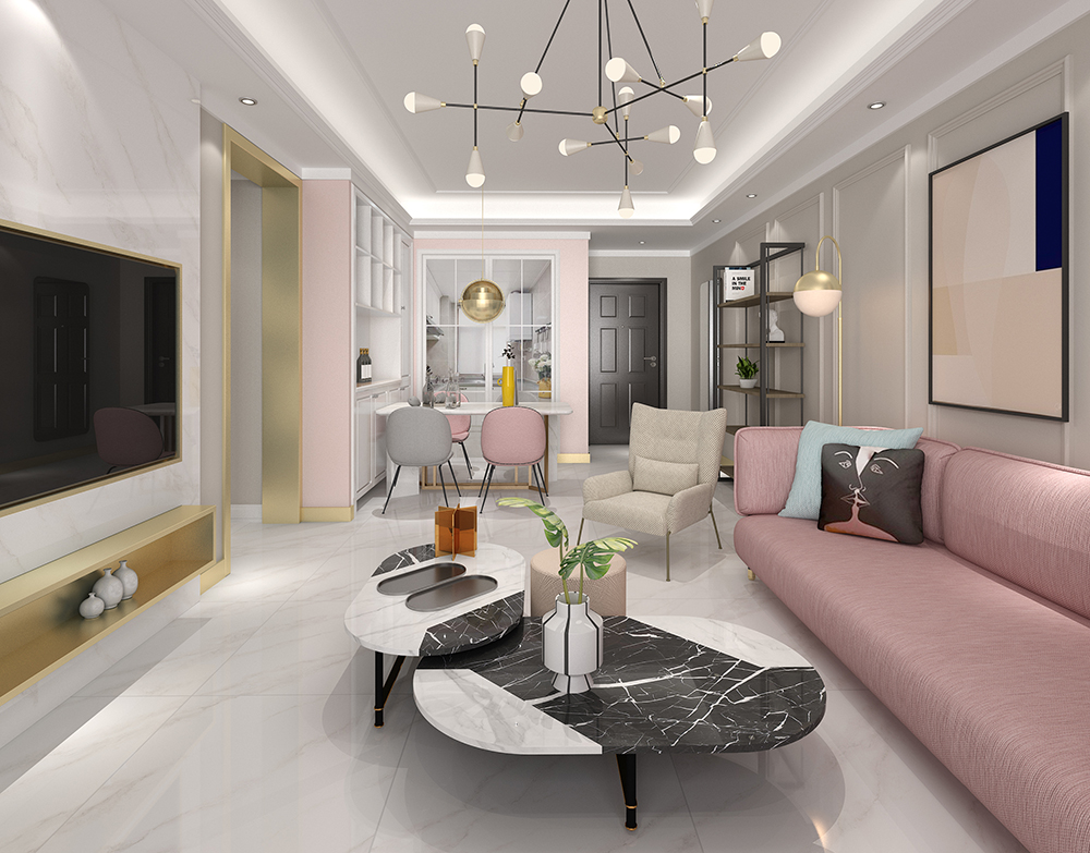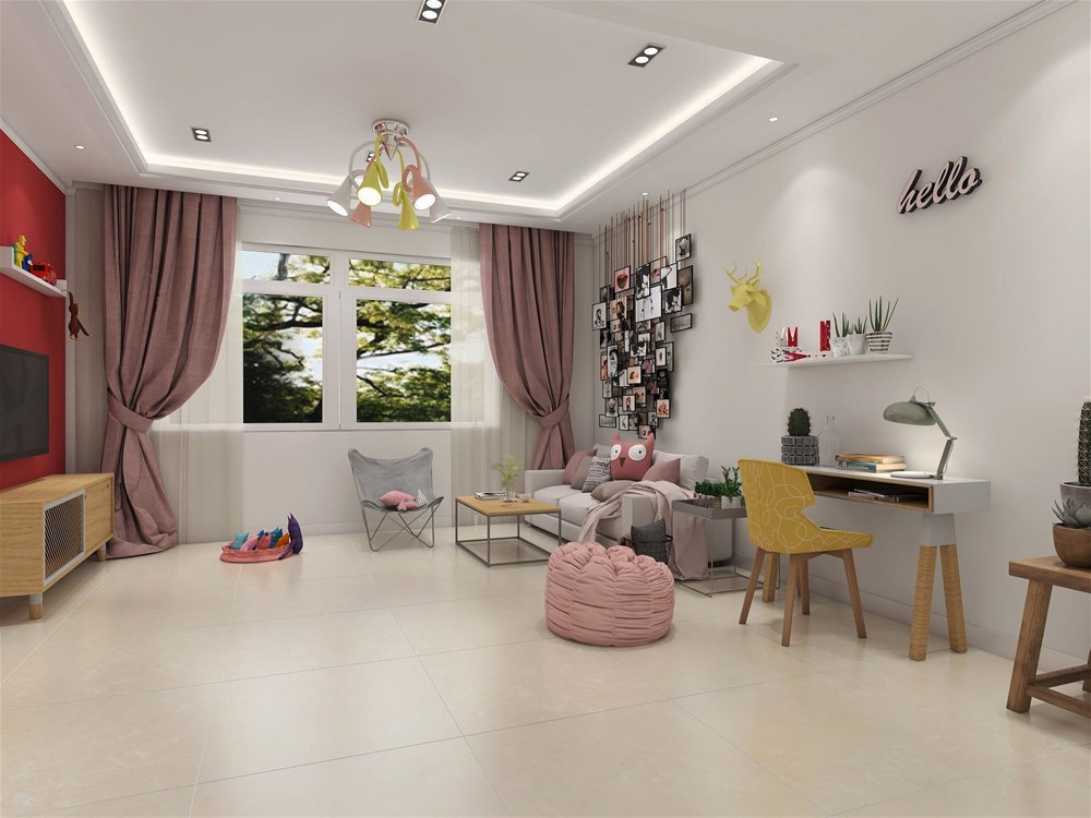 米黄的地砖与粉色碰撞出温馨、愉快的气氛