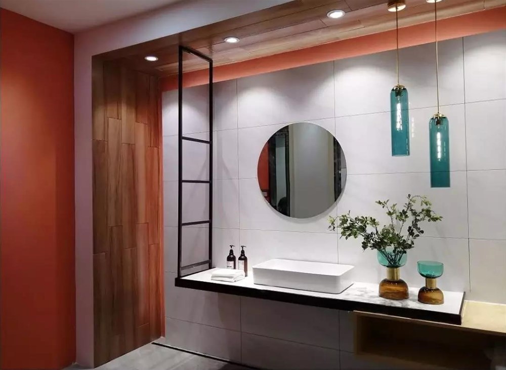 KPG48035是一款400*800规格的单面精雕干粒瓷片,洗手台背景采用了150*900规格木纹砖KFG159C12,营造出了木质的柔和,中和了灰色调的冷清,给卫生间带来了轻松的氛围。48035是一款采用精雕干粒工艺的瓷片,通过精雕釉和干粒让瓷片有凹凸的条状布纹立体感,让墙面更有空间感。