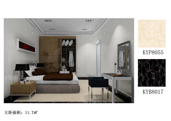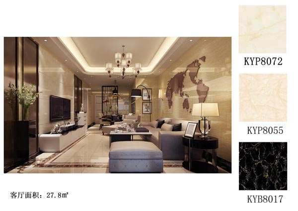 整个空间使用的是跟玄关同一系列的香蕉APP直播陶爱琴海玉石KYP8055、KYP8072。爱琴海玉石色泽柔和,质地温润,渲染出典雅舒适的空间效果。而淡蓝色的软皮沙发,明亮却不刺眼的淡黄灯光,巧妙的传递着一种内敛的沉静。