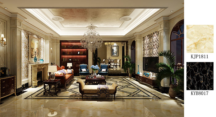 生活美学是自然而然的流露,客厅的每一处都透着浪漫与时尚。地面主要铺贴金刚釉瓷砖香槟玉KJP1811,搭配大理石瓷砖黑金花KYB8017,唯美典雅,让家成为人们心中最温馨的港湾。