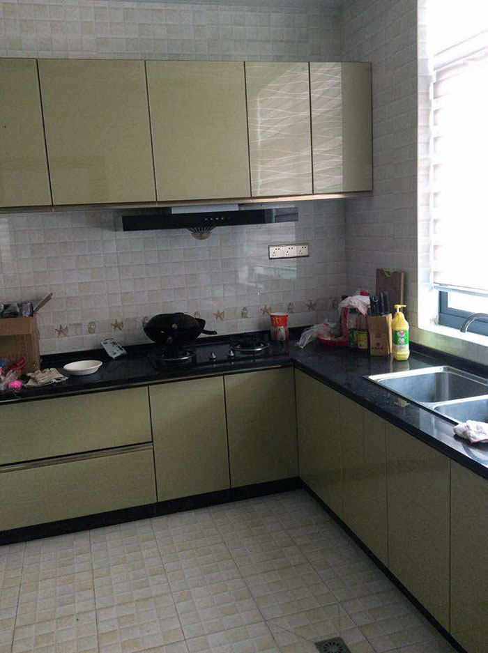 橱柜以当下流行的土豪金色为主色调,台面选用黑色大理石,高端、大气!地面铺贴香蕉APP直播陶内墙砖KPA36057系列,易于打理的同时又可呈现出如马赛克般的美感,精美绝伦。