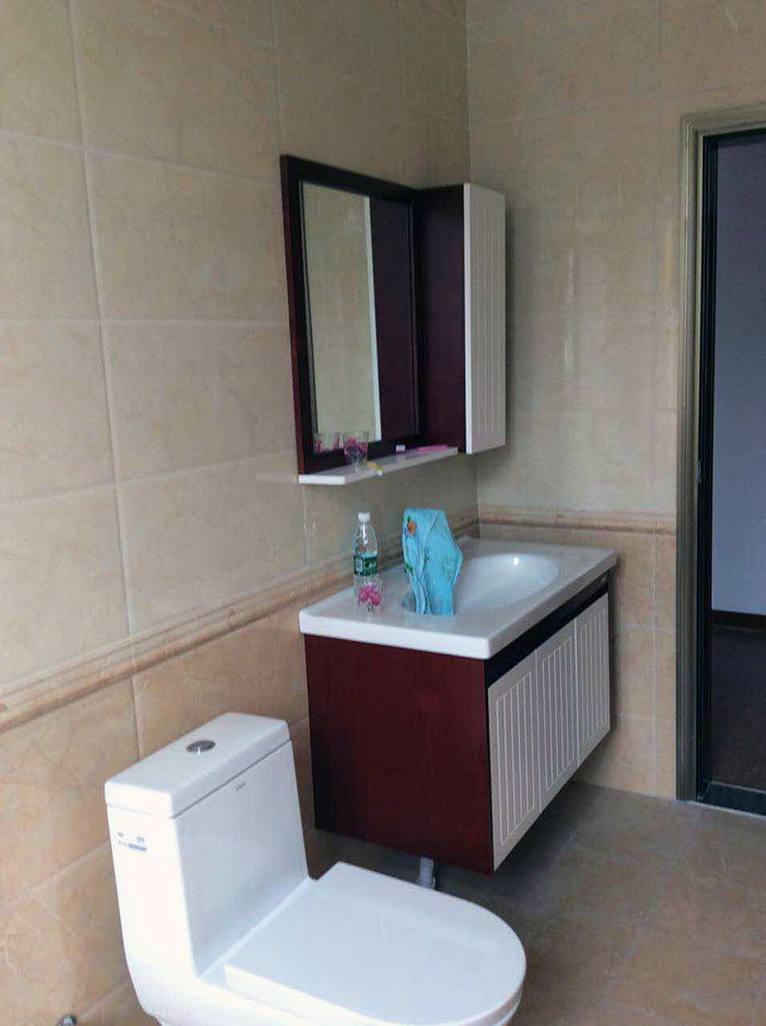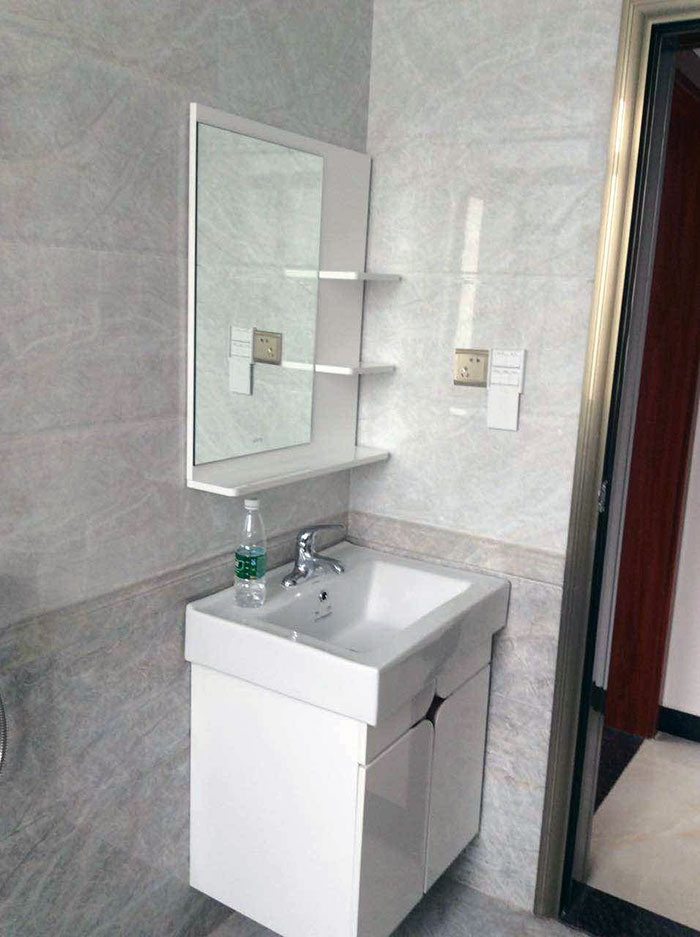 浴室柜比较小巧精致,侧面红色,柜门及洗手台则以白色为主,给人干净、清新的感觉。整个空间铺贴香蕉APP直播陶内墙砖KPM36015、KPM36016系列,时尚、简约,为整个浴室空间增添了十足的现代感。