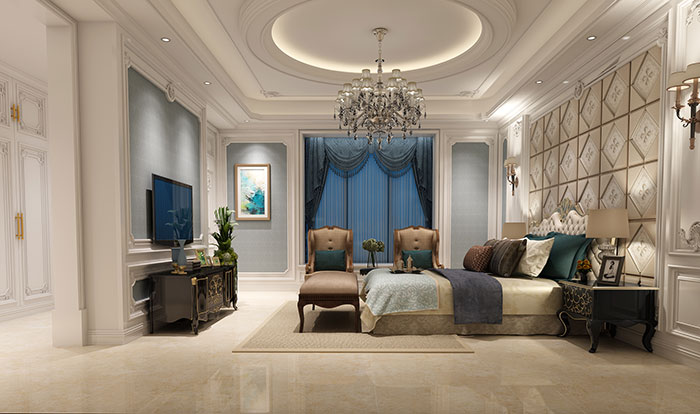 这是一个很大的客厅,因此设计师设计了一个造型别致的吊顶,镶金边的异型吊顶图案,使平面的天花板呈现出立体感,恢弘大气。
