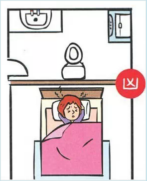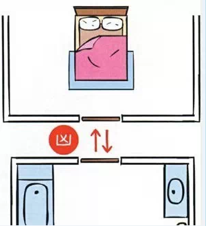 房间里的厕所对到床,情况比房门对到厕所严重:对到头,会头痛、思考时不能集中,住久了容易产生肿瘤、中风等;对到腰,会腰酸、心脏无力、水肿,住久了容易产生糖尿病、心脏病;对到脚,会坐骨酸痛、膝盖无力、痛风水肿,住久了容易产生意外骨折。
