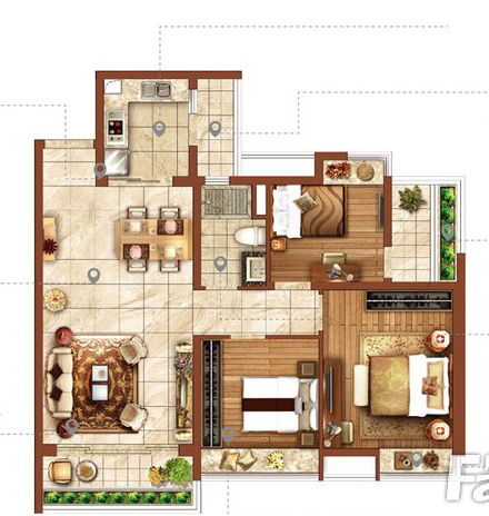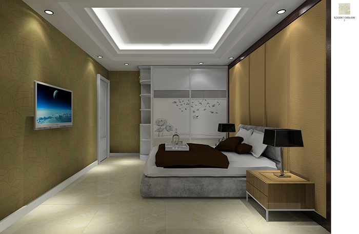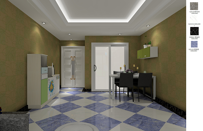 地面以蓝、白色为主,给人一种小清新的感觉。在瓷砖的铺贴方式上也蛮是新意,地面的菱形铺贴,电视背景墙的宽、窄长条形铺贴,让家不在显得单调无味。