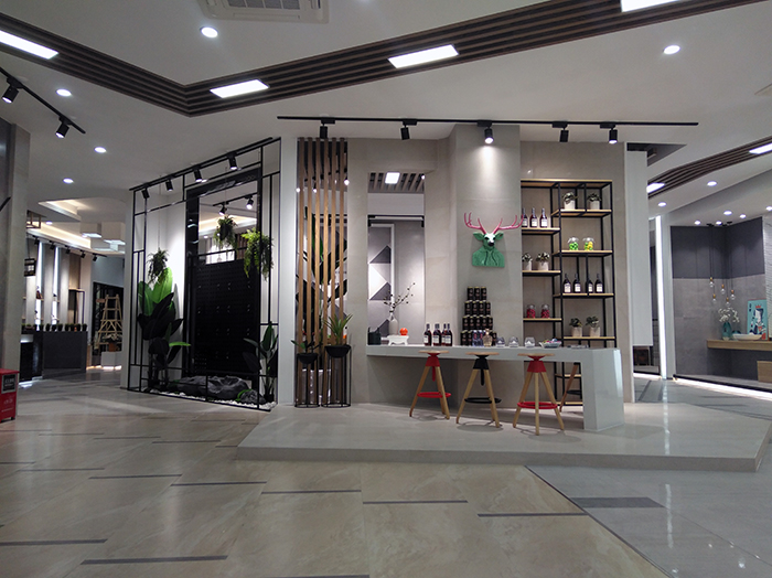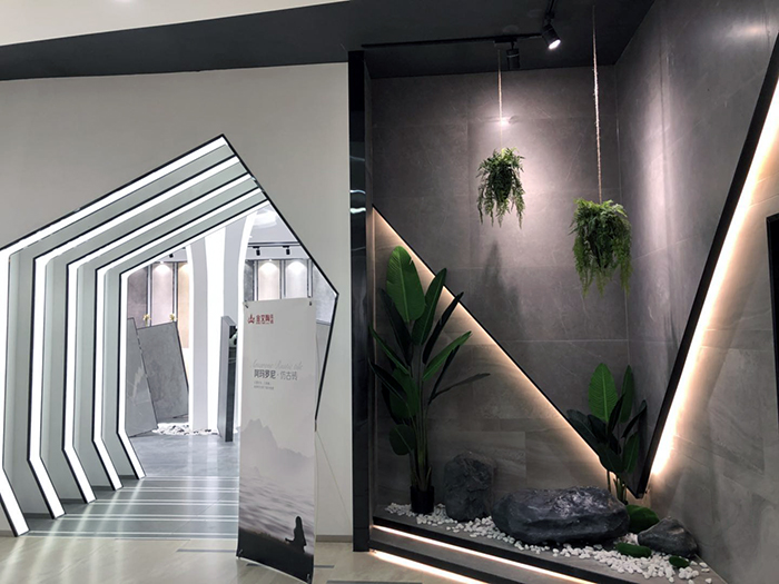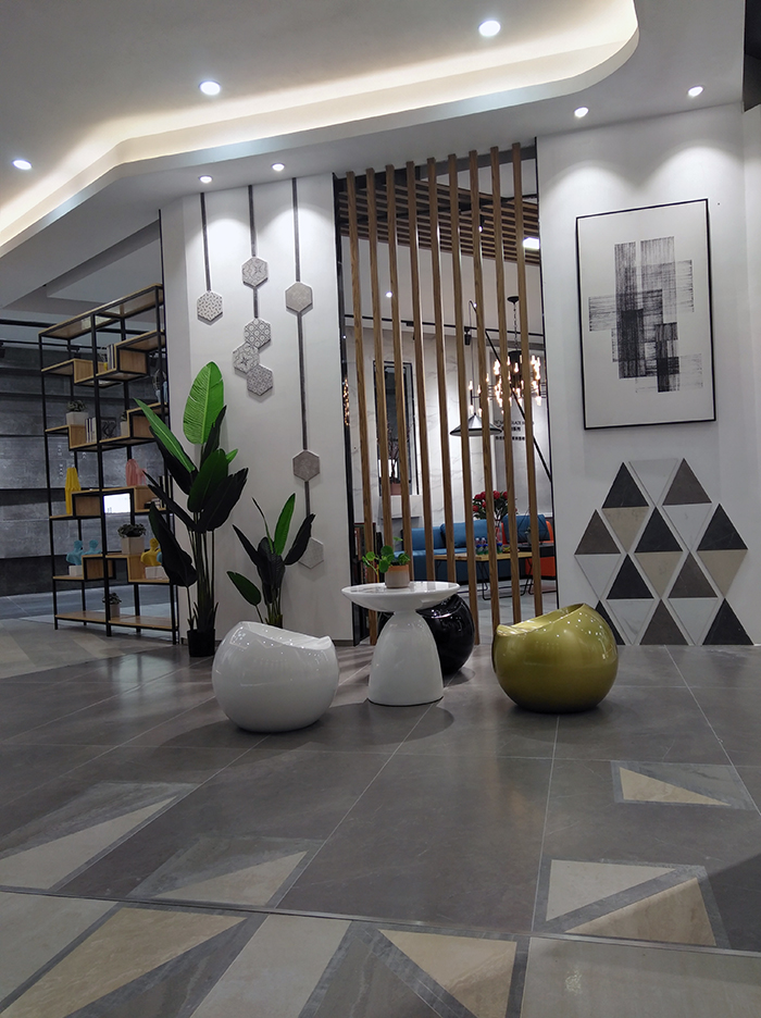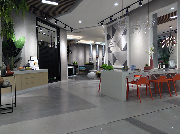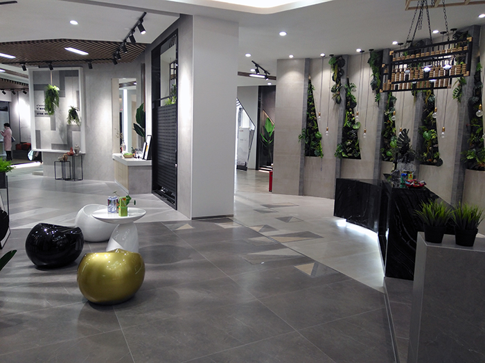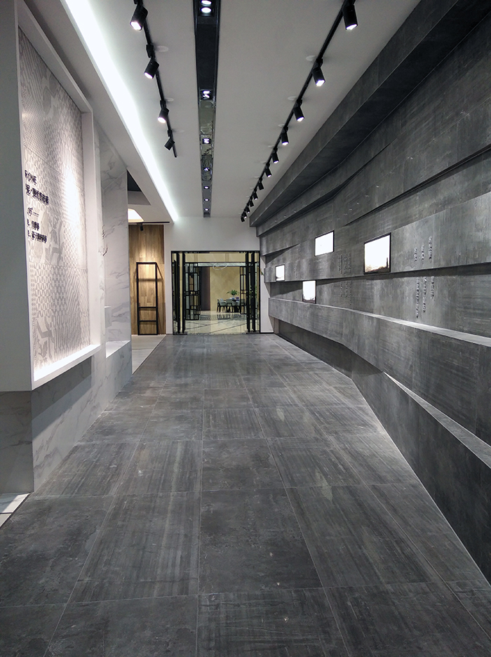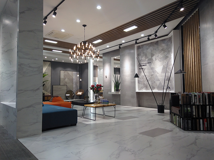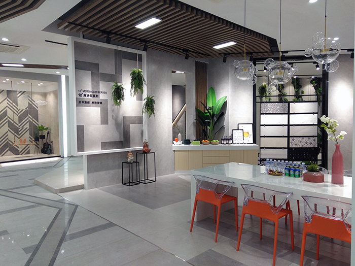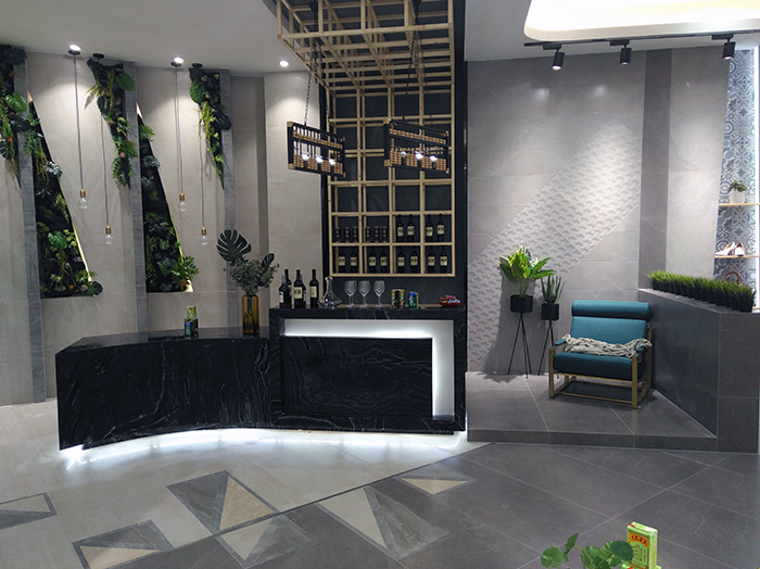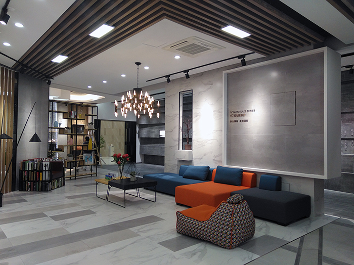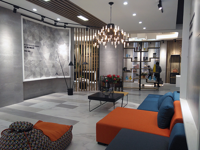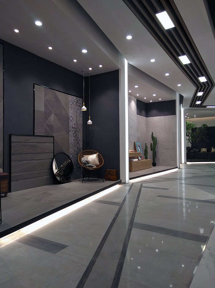 新展厅主要运用现代仿古砖阿玛罗尼、15°缎光釉产品,主打现代简约风格,个性独特的灯饰,沉稳大