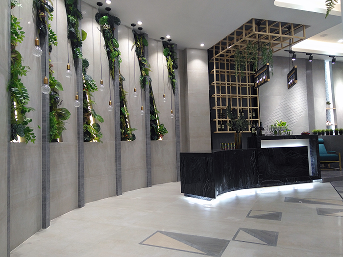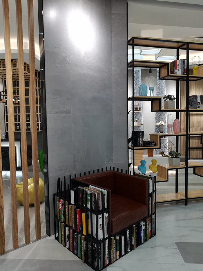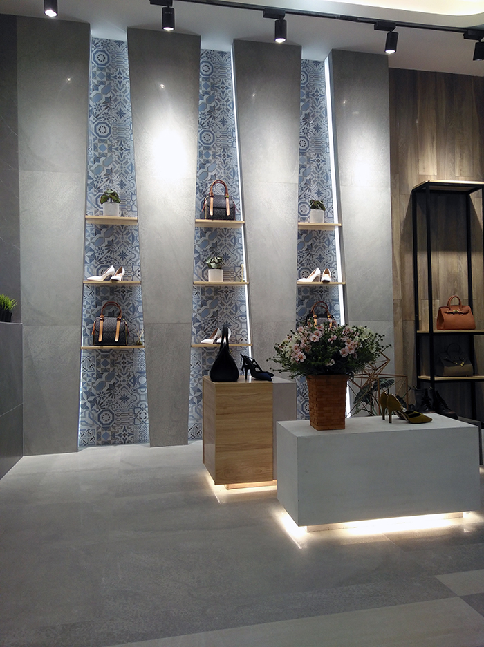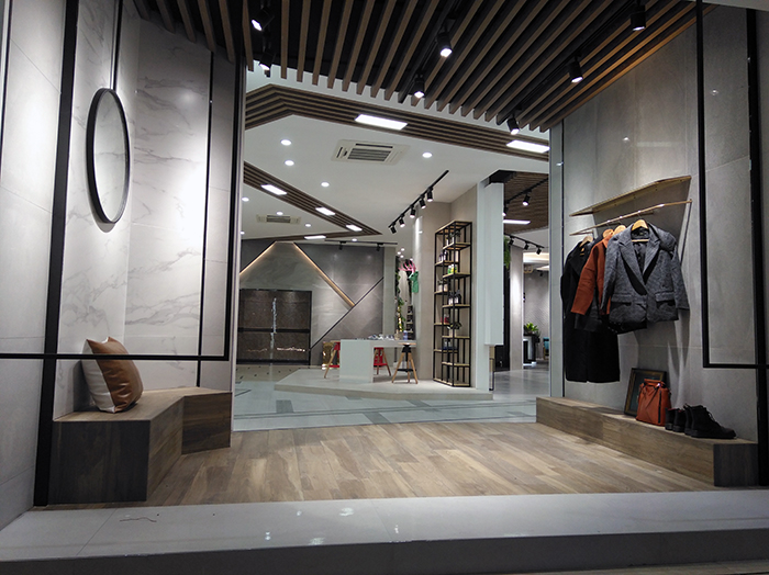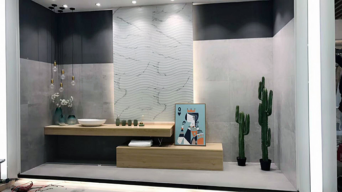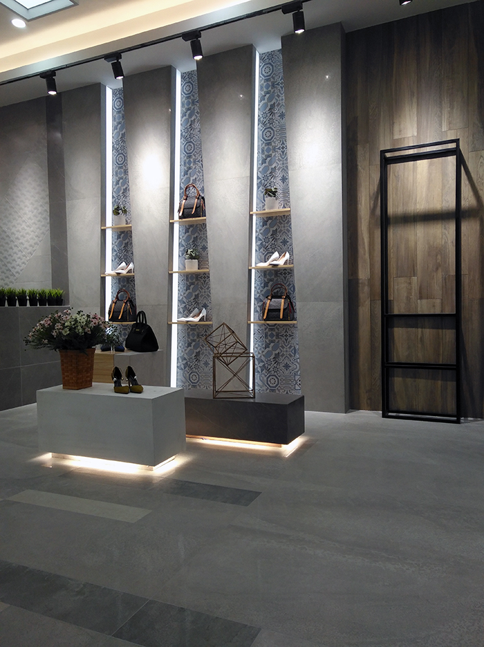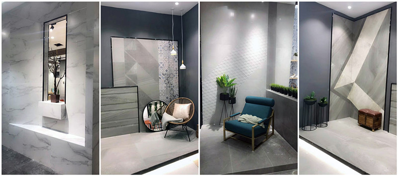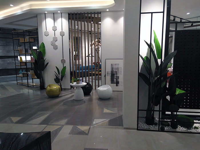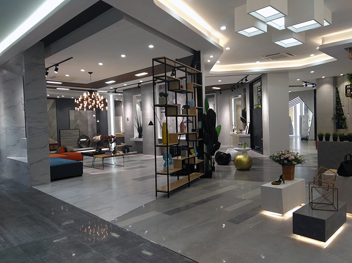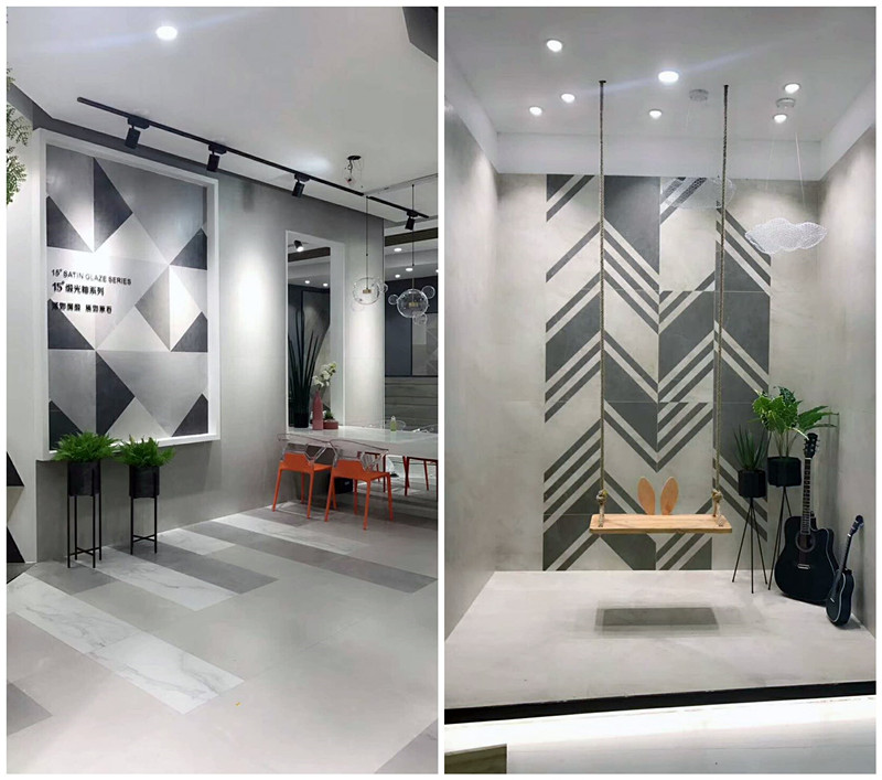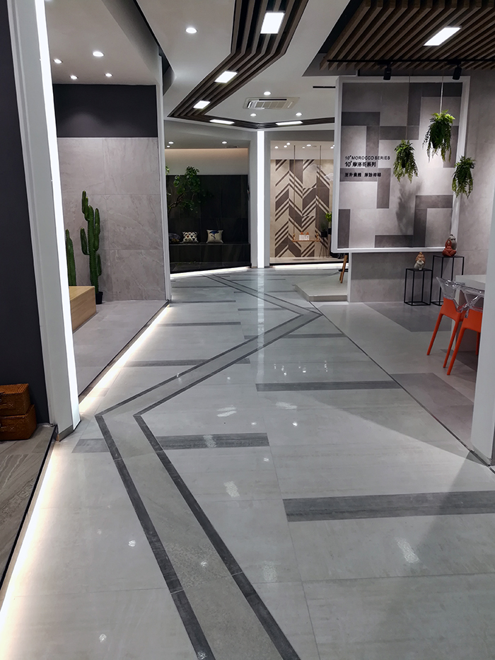 新展厅主要运用现代仿古砖阿玛罗尼、15°缎光釉产品,主打现代简约风格,个性独特的灯饰,沉稳大