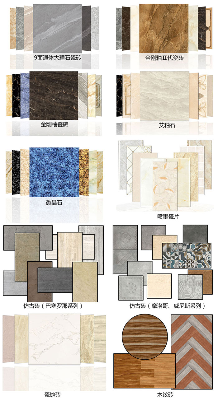 目前拥有缎光釉、瓷抛砖、9面通体大理石瓷砖、金刚釉Ⅱ代瓷砖、仿古砖、木纹砖、艾釉石、2.0厚微晶石、内墙砖(瓷片)、抛光砖等多个品类200多款产品花色。