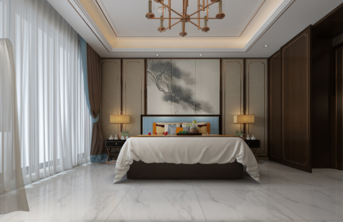 卧室家具采用实木纹,高贵大气,设计成松子样式的屏风完美的体现了不可居无松的文人理念,配合深蕴古风的灯具,更显古典。白色系落地窗帘与地砖相得益彰,整个卧室透着一丝丝凉意。