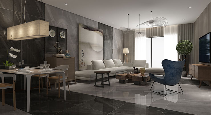 灰色沉静内敛的气质能烘托客厅的氛围,