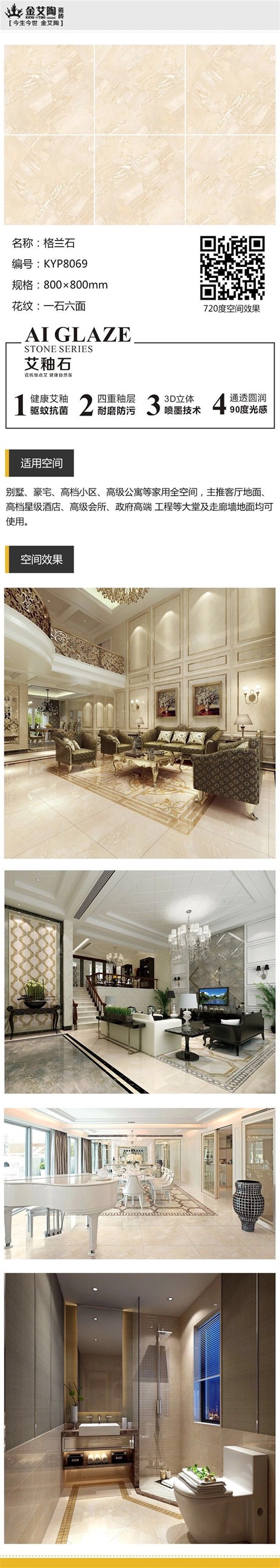 2、超平,耐磨,瓷砖加点艾,健康自然在,性价比极高,走量竞争产品,色彩丰富,款式多样。比同类香蕉APP视频污版在线的普通全抛釉更平更硬更亮。另外,配套更全,有配套的花片,和600规格的地砖,在终端销售更好推销,也是节假日或开业活动可以做促销的产品。