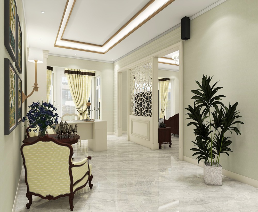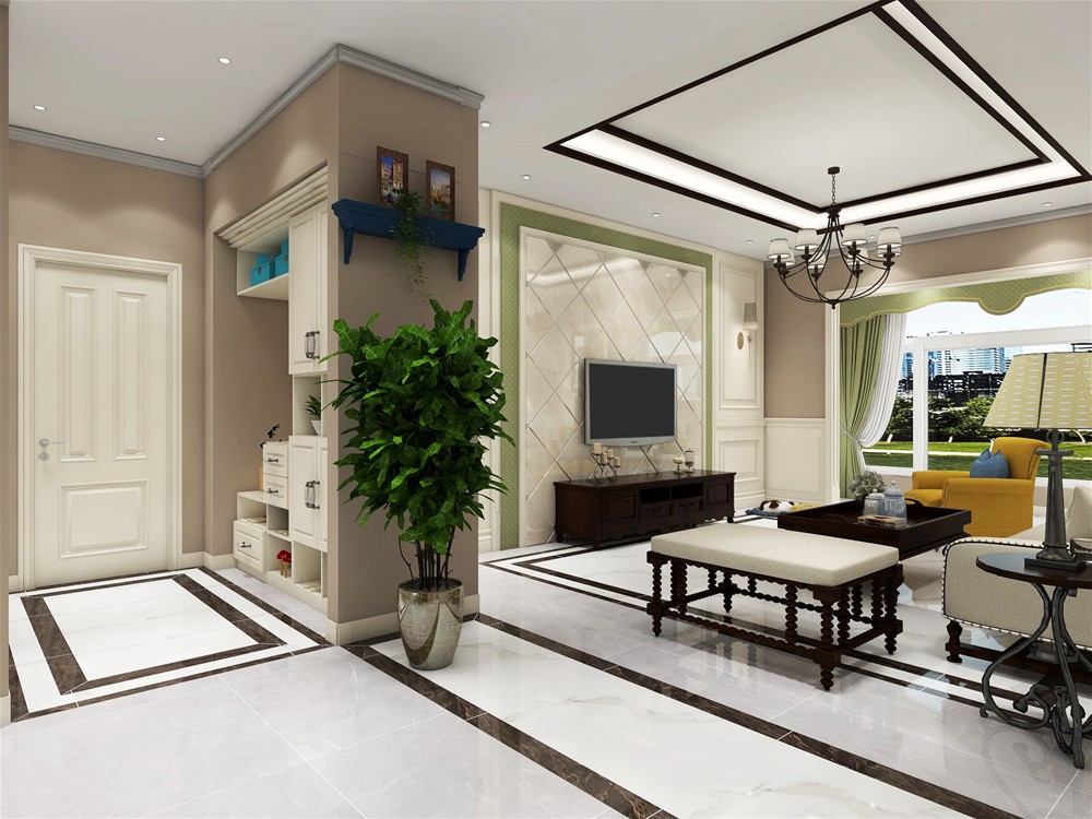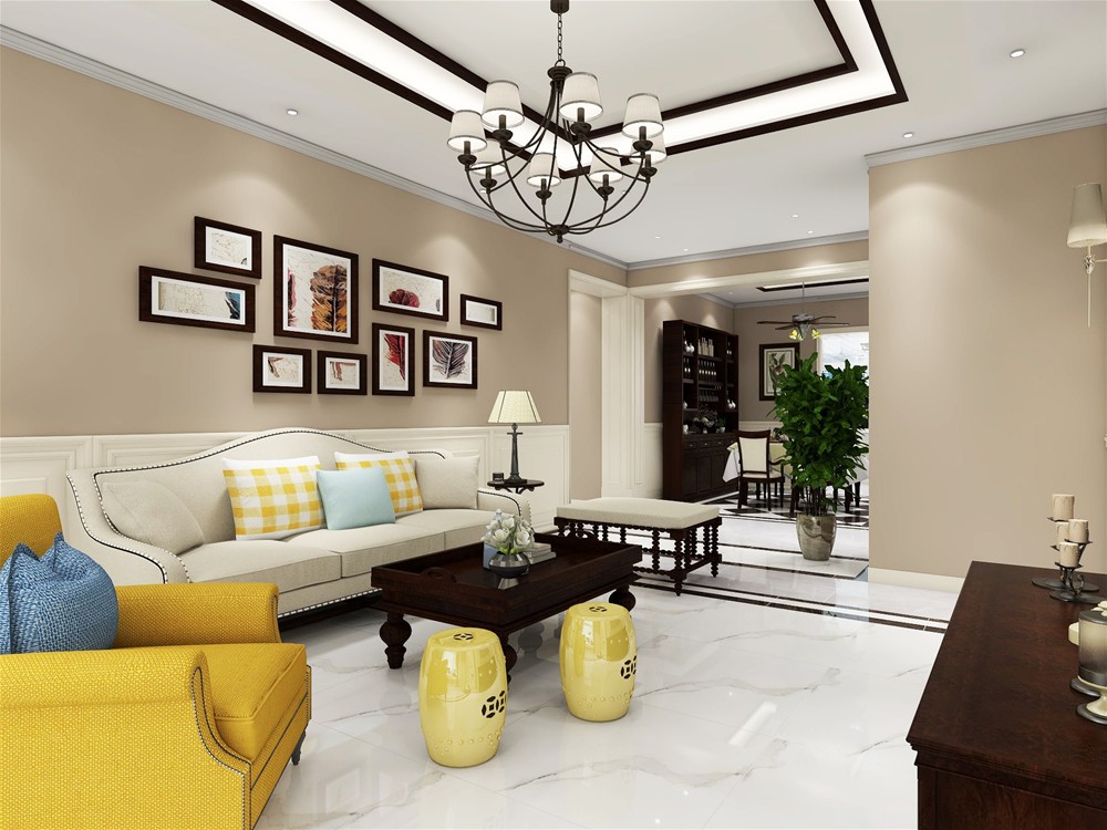 宽敞的空间布局带来清爽明快之意,温暖的色调,光亮的仿大理石纹理瓷砖,让人百看不腻。利用石膏线巧妙的勾勒空间立面及顶面的层次感;没有一丝琐碎多余的设计,带来最舒适的家居体验。米黄色仿大理石瓷砖铺贴的电视背景墙,带着丝丝温馨的气氛;明黄色布沙发略显粗犷的纹理,让人触碰美式不羁的品质感,诠释着随性而为,随心而做的生活理念。
