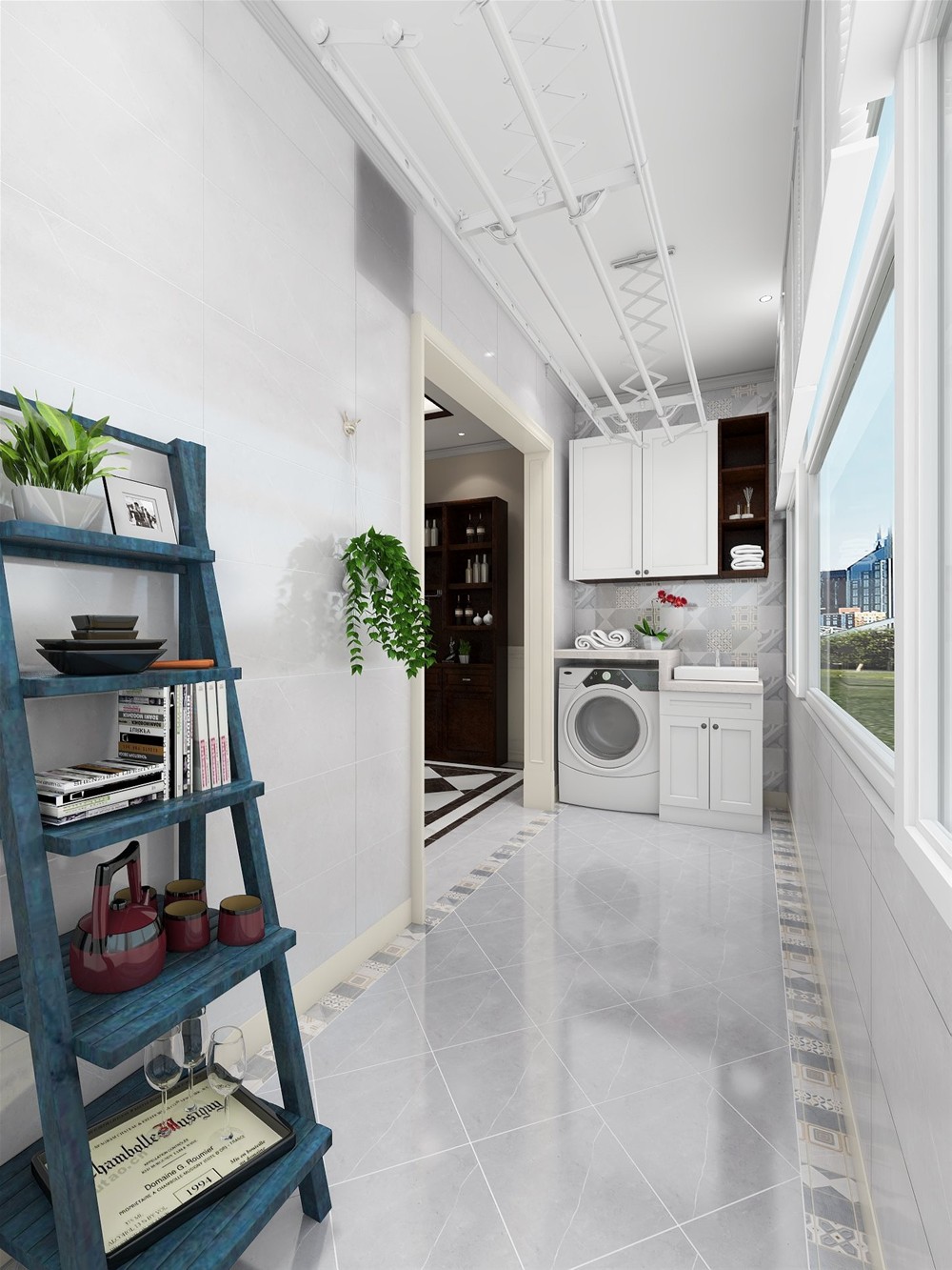 小小的阳台把空间布局发挥得极致,左手边是收纳柜,把洗衣机内置,不会占用多余的地方,天花是晾衣服的架子,地砖选用防滑的喷墨瓷片,此款瓷片也是香蕉APP直播陶能上墙下地的配套产品,左边墙面用相对花俏的图案与正面墙分隔开来,值得一提的是阳台的采光度极好,采用百叶窗帘可以随意调动。