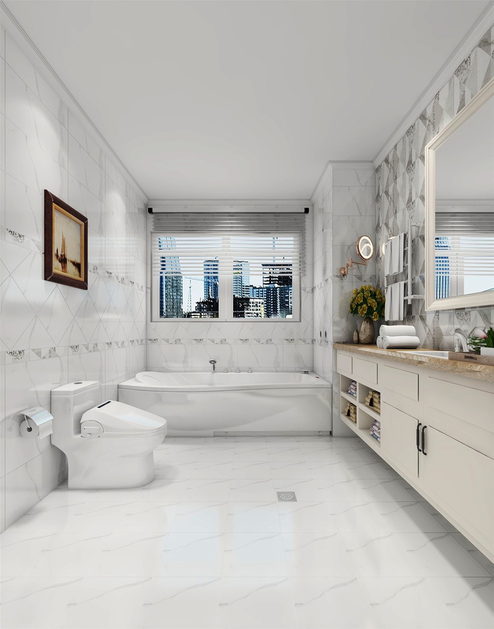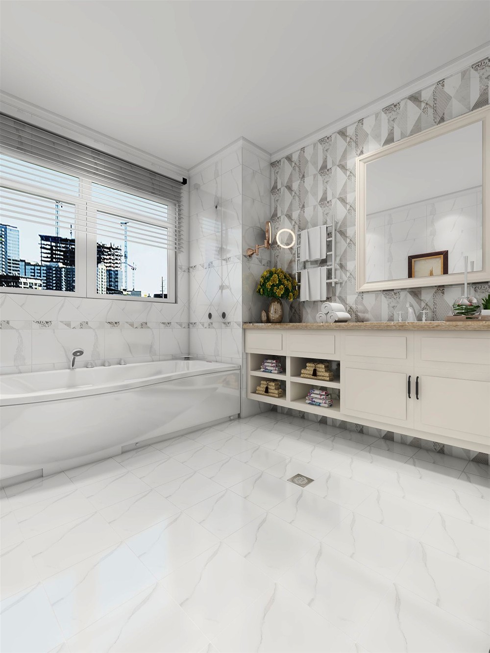 整体空间采用白色大理石纹理喷墨瓷片,布局宽敞明亮,几何图形的瓷片墙面,让沐浴区与洗手台有了巧妙的区分。米黄色大理石纹理的洗手台耐脏,洗手台下是多功能的储物柜,有拉式柜桶也有开放式柜桶,考虑得十分周到。